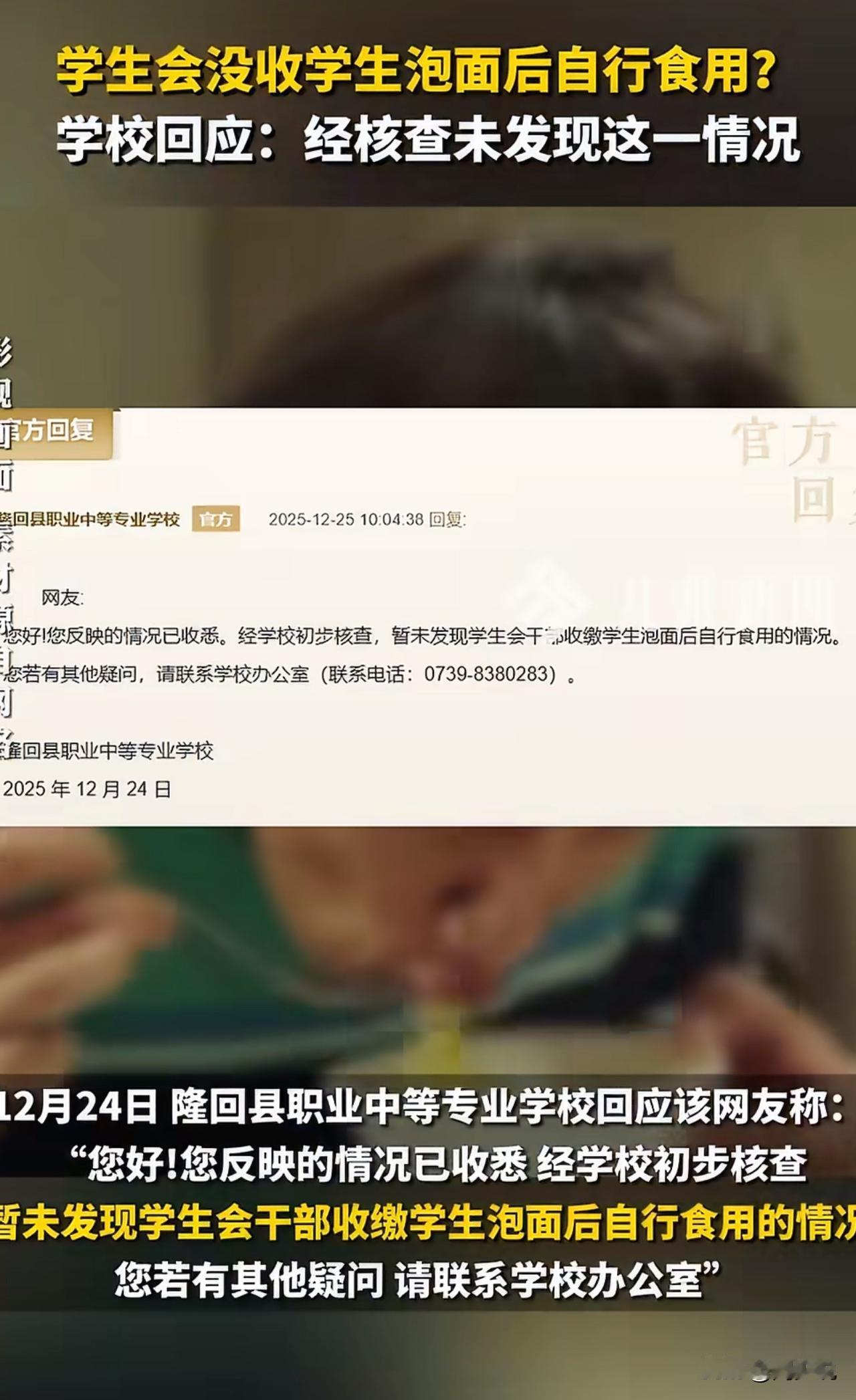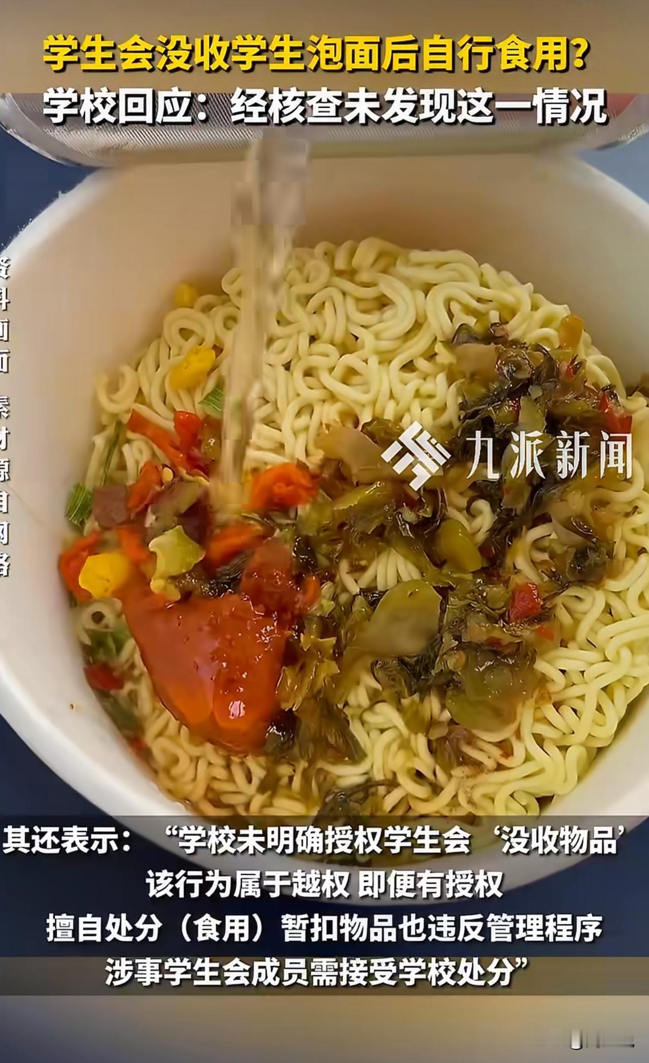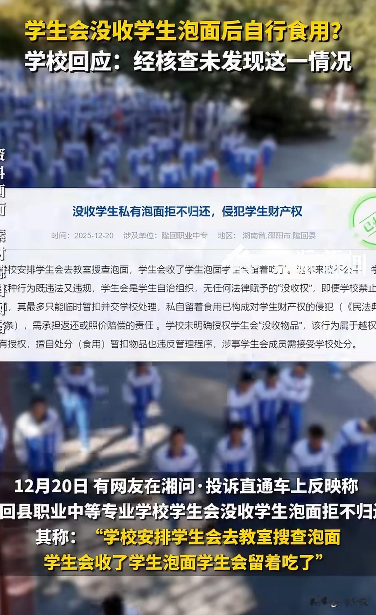 “这确实不应该!”近日,有网友在投诉平台反映:隆回县职业中等专业学校学生会进教室搜查泡面,把学生的泡面收走后,竟然留下来自己吃了。 发帖人称,即便学校禁止存放泡面,学生会最多只能“临时暂扣并上交学校”,私自留着吃,已经侵犯了学生的财产权,既违规也涉嫌违法。 他还指出,学校并没有明确授权学生会“没收物品”,这种做法属于越权;就算有授权,擅自把暂扣的泡面吃掉,也严重违反管理程序,涉事学生干部理应被严肃处理。 针对此情况,学校回应称:“经初步核查,暂未发现学生会干部收缴泡面后自行食用的情况,如有疑问可联系学校办公室。” 此事曝光后,有网友说:“学生会不是执法者,更不是特权阶级,拿着所谓管理当幌子占小便宜,性质比吃几包泡面严重多了。” 也有网友认为:“如果真没这回事,学校应公开更详细的调查过程,而不是一句暂未发现就结束,教育场景下,信任比什么都重要。” 看了一下事情的经过,周少认为出现这种情况,本质却是校园权力边界和规则意识的教育缺失。学生会本应是“服务同学、协助管理”的角色,一旦被默许或赋予过度的“检查权”“没收权”,很容易滋生“小权力滥用”,让学生误以为“有职务就有特权”。 其次,学校在制定管理规定时,必须明确:谁有权查、谁有权收、物品如何登记、如何处理,形成可监督的流程,而不是把“管理权”简单下放给学生。 真正的教育,是让所有学生都明白:规则面前人人平等,权力必须被关在制度的笼子里,哪怕只是一包泡面,也不能成为“例外”。 对学生来说,被尊重、被公平对待,比被“管得服服帖帖”重要得多。只有在尊重与规则并存的校园里,孩子才能学会如何做一个有边界感、有责任感的公民。#寻美三湘# #长沙新朋友#