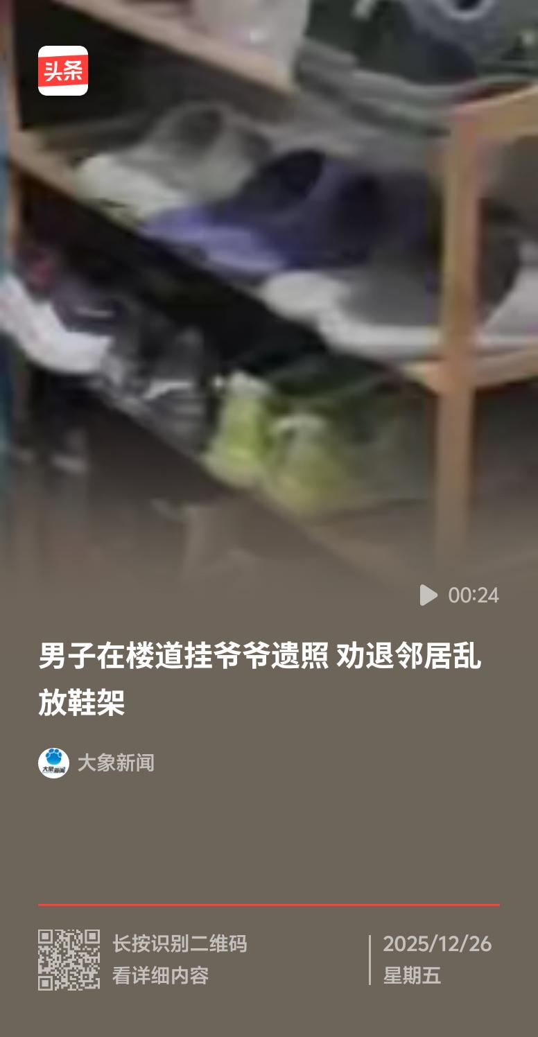 12月26日湖南这事儿太逗了。邻居把鞋架等杂物放楼道,男子多次沟通,还找了物业,可邻居耍无赖,说房东同意摆放,还占了电梯前的地儿,放了桌子、自行车,旁边拖鞋散落,既不美观又有安全隐患。 男子忍无可忍,直接把爷爷遗照挂楼道,还添了电子香烛和案台。邻居立马认怂,求沟通。网友纷纷叫好,小区群里也有人说邻居之前不理人,现在只能服软。虽说这招解气,但也易激化矛盾。邻里本应和睦,占公共资源真不可取,有事儿还是得好好沟通。 邻居的糟心事 邻居堆杂物