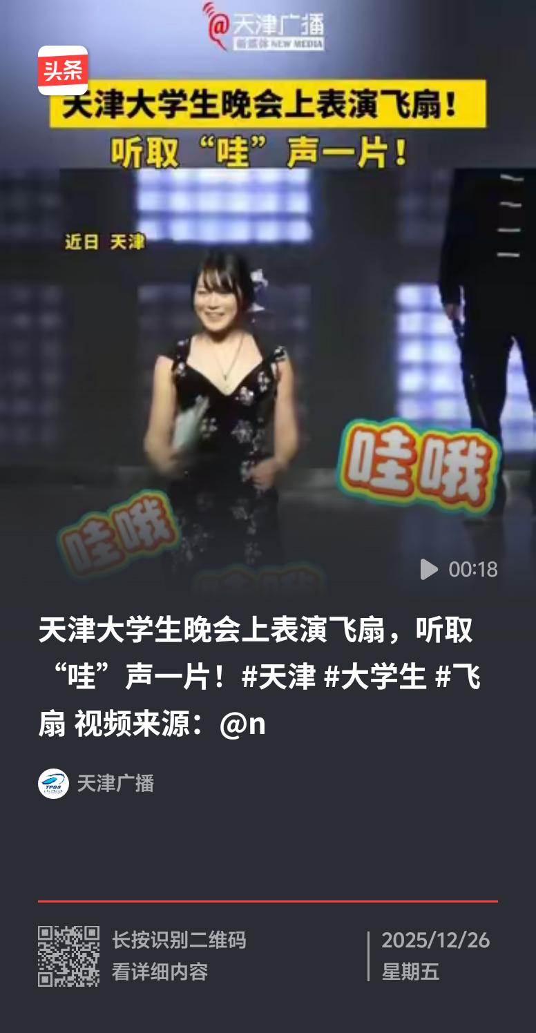 现在大学生的才艺表演太炸裂了!之前天津大学生晚会上的飞扇表演超惊艳,现场那是一片惊呼。想想看,在舞台灯光的映照下,表演者灵活舞动飞扇,动作行云流水,台下同学都忍不住发出“哇”声。还有大学女生旗袍走秀配飞扇表演,身着旗袍的女生们迈着优雅的步伐,手中飞扇一开一合,瞬间就把大家“拿捏”住了,台下瞬间啊声一片。不得不说,大学生们真是多才多艺,一场表演就能带来视觉盛宴,让人感受到青春的活力与魅力。 校园特色表演 大学生时装比赛 学生台上的表演