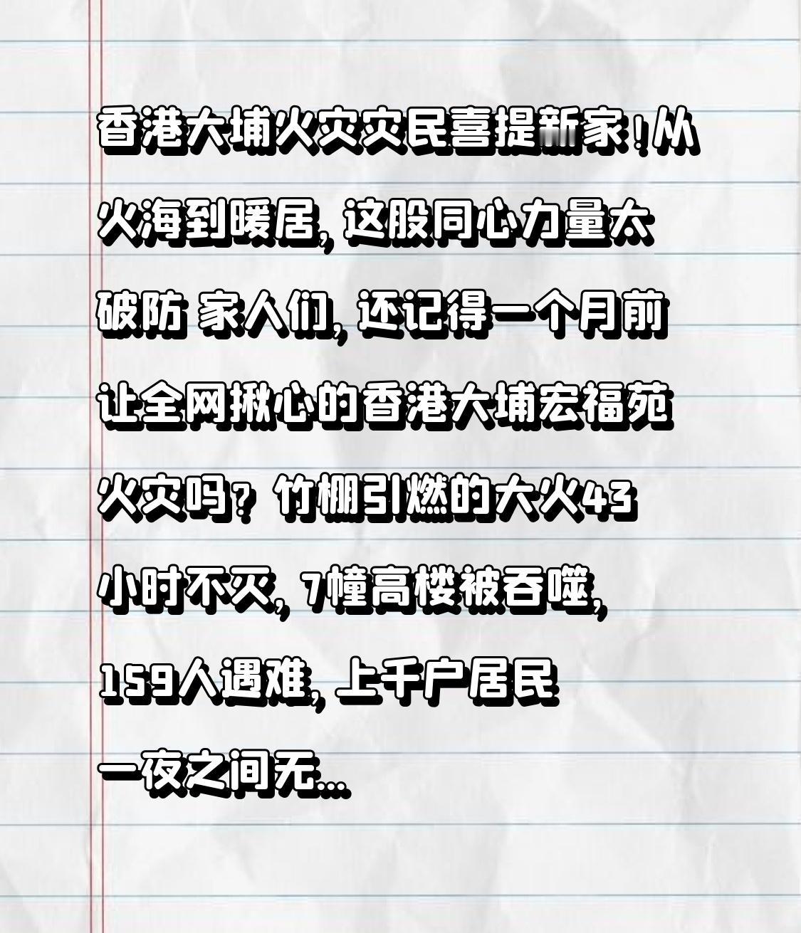 香港大埔火灾灾民喜提新家!从火海到暖居,这股同心力量太破防 家人们,还记得一个月前让全网揪心的香港大埔宏福苑火灾吗?竹棚引燃的大火43小时不灭,7幢高楼被吞噬,159人遇难,上千户居民一夜之间无家可归。当时浓烟蔽日的画面还历历在目,如今好消息传来——受灾居民终于住进新家了!这背后的暖心故事,比寒冬里的暖阳更治愈。 谁能想到,这场被定性为“重大灾难”的火灾,曾让无数家庭陷入绝境。起火的宏福苑是楼龄40年的老小区,火灾当天强风裹挟“飞火”跨楼蔓延,居民连随身物品都来不及拿就仓皇逃生 。起初大家挤在体育馆、社区会堂的临时避难所,夜晚裹着捐赠的毛毯入眠,不少老人对着烧毁的家宅默默流泪。那时没人敢想,多久才能重新拥有一个安稳的家。 但转折点来得又快又暖!火灾发生后,中央第一时间响应,应急物资一批批火速驰援,照明无人机、机械外骨骼装备等专业设备增强救援能力,内地爱心物资跨城接力送到灾民手中 。香港特区政府迅速启动安置计划,“一户一社工”全程跟进,从临时酒店到过渡性房屋,精准对接每个家庭的需求。梁太太老两口就是受益者,社工不仅帮他们申请了带长者配套的过渡屋,还全程协助办理经济援助,让他们感慨“多了个社工家人” 。 更让人动容的是全城同心的力量。28亿港元爱心捐款源源不断汇聚,企业捐出酒店客房、生活物资,普通市民自发排成长队“人链”搬运物资,街头的“爱心小山”堆得比人还高 。有深圳市民连夜整理衣物毛毯,通过口岸交接给香港志愿者;澳门特区捐助3000万港元,港澳同胞的深情厚谊在灾难中愈发浓烈。从政府到民间,从内地到香港,大家拧成一股绳,把“不可能”变成了“马上办”。 如今走进元朗的过渡性房屋社区,窗明几净的房间里,居民们忙着摆放新家具,孩子们在楼下嬉戏打闹。曾经被火灾灼伤的心灵,正在被安稳的生活慢慢抚慰。社工们还在持续跟进,心理疏导、就业帮扶、物资补给样样不落,让每个家庭都能感受到实实在在的温暖。 这场灾难留下了伤痛,但也见证了团结的力量。从火海逃生到重归家园,从流离失所到安稳度日,这不仅仅是新家的重建,更是人心的凝聚、温情的传递。正如一位灾民所说:“房子没了,但爱还在,有家的地方就有希望。” 灾难无情,人间有爱。当我们守望相助,就没有跨不过的难关。你被这场同心救援中的哪个细节打动了?评论区聊聊~