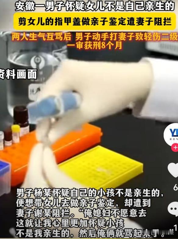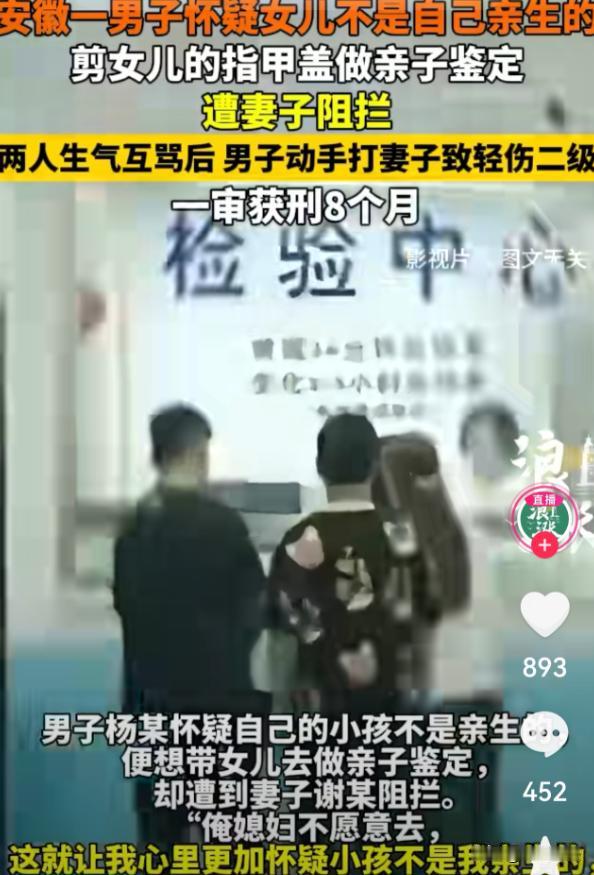 安徽,杨某在上海工作很忙,因一直怀疑女儿非亲生,想趁假期带孩子做亲子鉴定,杨某准备剪女儿指甲盖和头发,遭到妻子谢某的反对,妻子的反对让杨某的怀疑更重了,两人争吵后爆发肢体冲突,杨某动手打了妻子,妻子跑出家门后,女儿报了警。经鉴定,谢某伤势构成轻伤二级,最终杨某被判有期徒刑8个月,还赔了12000元。 (来源:浪涨新闻) 杨某,是安徽人,为了生活,在上海努力打拼。 每天,他都在忙碌的工作中度过,加班加点成了家常便饭,很少有时间能好好休息,更别说回老家看看了。 2025年的五一假期,给了杨某一个难得的回家机会,他拾好行李,踏上了回安徽老家的路,心里还盘算着这次回去要好好陪陪家人。 可杨某心里一直有个解不开的结,不知道从什么时候开始,他总是怀疑女儿不是自己亲生的。 这次五一假期回老家,他觉得机会来了,就打算趁这个时间带孩子去做亲子鉴定,好让自己心里踏实。 事发当天,杨某看女儿在一旁玩耍,就悄悄准备剪女儿的指甲盖和头发。 他认为这些样本,应该能用来做亲子鉴定。 可就在他刚要动手的时候,妻子谢某发现了他的举动,一下子就急了,坚决反对他这么做。 谢某觉得杨某这样做太荒唐了,会伤害到孩子的感情,也会影响夫妻之间的信任。 杨某看到妻子反对,心里的怀疑却更重了。 他觉得妻子这么激烈地反对,肯定是因为心里有鬼,说不定女儿真的不是自己亲生的。 他的情绪一下子就激动起来,和妻子争吵了起来。 两人你一言我一语,谁也不肯让步,在争吵的过程中,杨某失去了理智,他觉得妻子就是在故意气他,一怒之下,他动手打了妻子。 这一巴掌下去,谢某被打得愣住了,她没想到杨某会动手,她委屈地转身跑出了家门。 这时候,在一旁的女儿,被这一幕吓坏了,看到妈妈跑出去,她报了警。 很快,民警就赶到了家里,了解了情况后,把杨某带走了。 而谢某跑出去后,心里又气又怕,她觉得自己太委屈了,本来好好的一个家,怎么就变成这样了呢? 之后,谢某去做了检查,经鉴定,她的伤势构成了轻伤二级。 这意味着杨某的行为已经触犯了法律,要受到法律的制裁。 杨某知道自己这次做得太过分了,不应该因为怀疑就动手打人,他承认了自己的错误,说自己当时太冲动了,没有控制好自己的情绪。 而谢某则坐在一旁,眼里满是伤心和失望,她希望能给她一个公正的判决。 根据《刑法》第二百三十四条规定:故意伤害他人身体的,处三年以下有期徒刑、拘役或者管制。犯前款罪,致人重伤的,处三年以上十年以下有期徒刑;致人死亡或者以特别残忍手段致人重伤造成严重残疾的,处十年以上有期徒刑、无期徒刑或者死刑。本法另有规定的,依照规定。 杨某主观上具有伤害妻子的故意,客观上实施了伤害行为,且造成了谢某轻伤二级的后果,完全符合故意伤害罪的范畴。 法院在审理时,考虑到杨某案发后积极到案且认罪态度较好,依据《刑法》第六十七条第一款规定:犯罪以后自动投案,如实供述自己的罪行的,是自首。对于自首的犯罪分子,可以从轻或者减轻处罚。其中,犯罪较轻的,可以免除处罚。 除了刑事责任外,杨某因其故意伤害行为给谢某造成了身体伤害和经济损失,依据《民法典》第一千一百七十九条规定:侵害他人造成人身损害的,应当赔偿医疗费、护理费、交通费、营养费、住院伙食补助费等为治疗和康复支出的合理费用,以及因误工减少的收入。造成残疾的,还应当赔偿辅助器具费和残疾赔偿金;造成死亡的,还应当赔偿丧葬费和死亡赔偿金。 法院审理认为,杨某故意伤害他人身体,导致谢某轻伤二级,其行为已经构成了故意伤害罪。不过,考虑到杨某在案发后能够积极到案,并且认罪态度较好,法院决定对他从轻处罚。 最终,法院判决杨某有期徒刑8个月,并且要赔偿谢某12000元。 杨某没想到自己的一时冲动,不仅伤害了妻子,还让自己陷入了牢狱之灾。 他看着法庭上妻子伤心的样子,心里充满了愧疚。 他暗暗发誓,等自己出去后,一定要好好弥补妻子,重新挽回这个家。 生活中,难免会遇到一些怀疑和矛盾,但是一定要保持冷静,用理智的方式去解决问题。 就像杨某,如果他怀疑女儿不是亲生的,完全可以通过合法的途径去做亲子鉴定,而不是用暴力去解决问题。 暴力不仅不能解决问题,反而会让事情变得更糟,甚至会触犯法律,给自己和家人带来伤害。 杨某要是真怀疑亲子关系,被老婆拒绝做鉴定,他可以去法院申请。 有必要证据,老婆还拒做,法院就认定他主张。 真不是亲生,杨某能离婚、要精神赔偿、追抚养费,还能多分财产。 可他偏动手犯罪,真是不懂法,太糊涂!