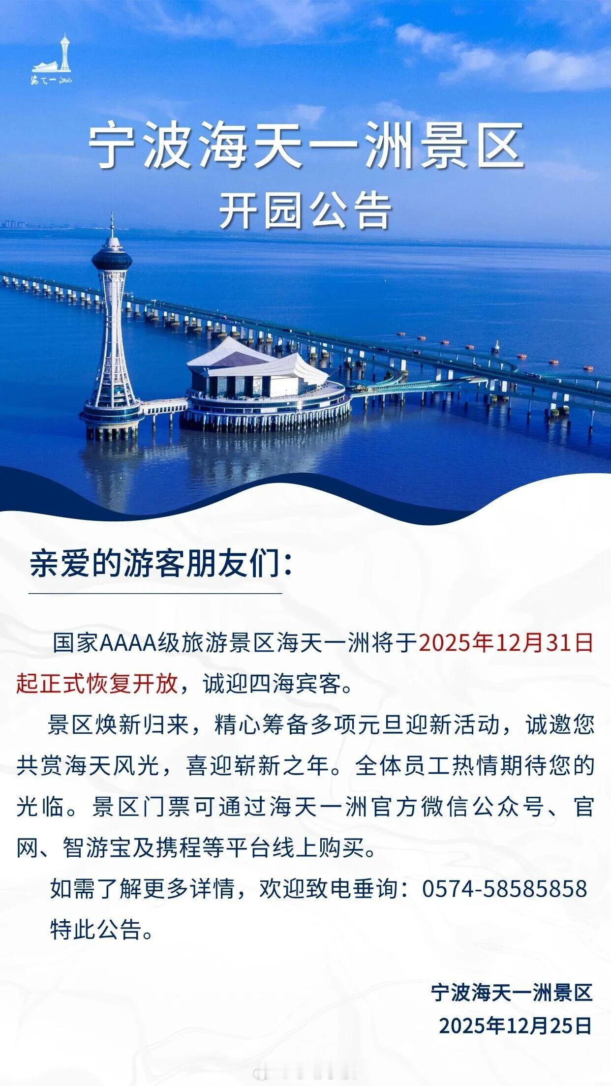 【宁波市这个4A级景区即将恢复开放 】近日,位于前湾新区的宁波海天一洲景区发布开园公告,宣布景区将于2025年12月31日起正式恢复开放↓↓↓同城热点创作计划 宁波