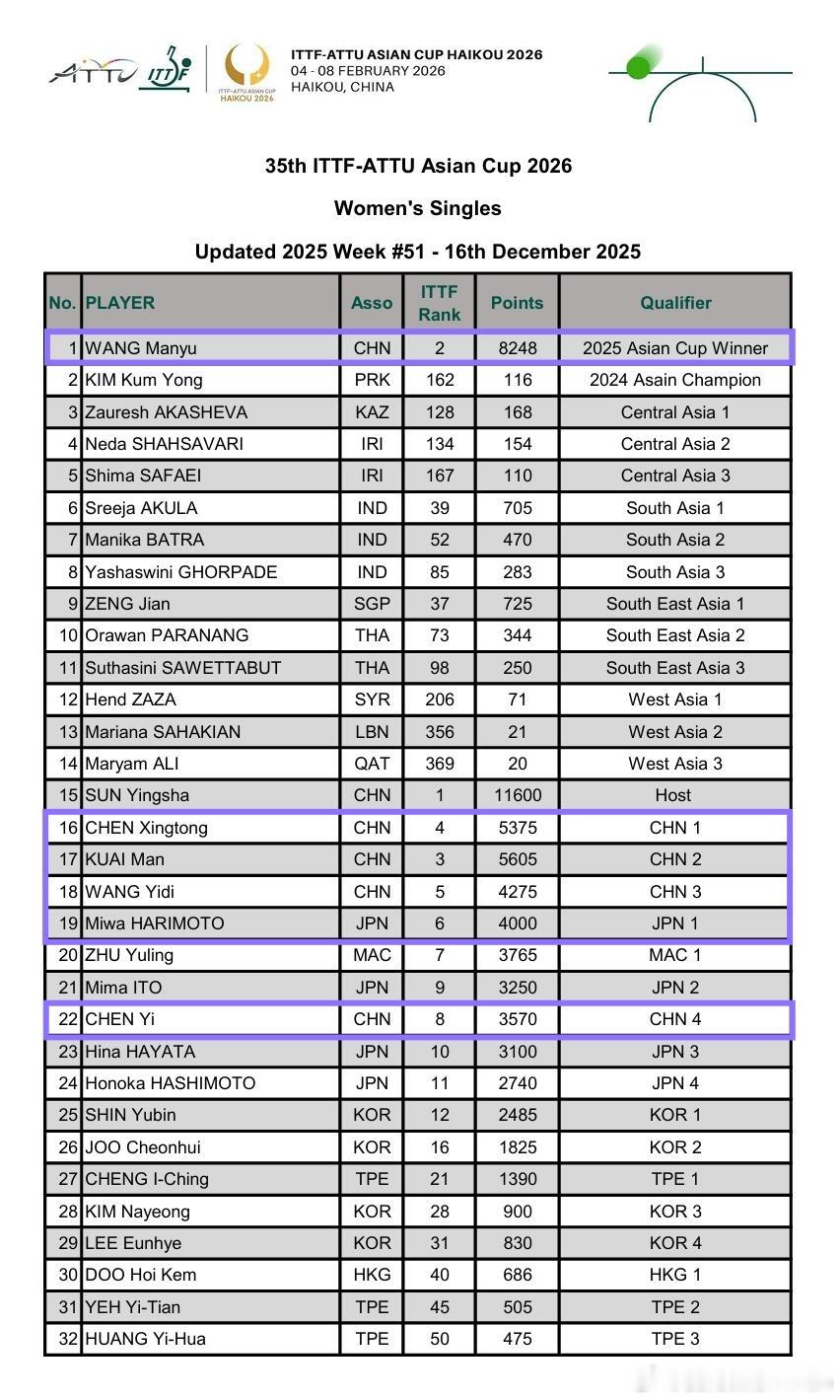 2026亚洲杯国乒初始邀请名单 2026年国际乒联海口亚洲杯资格名单:国乒拟受邀名单如下,实际名单还需中国乒协确认男单:王楚钦(2025年亚洲杯冠军)、林诗栋(主办方外卡)、梁靖崑、向鹏、陈垣宇、周启豪(世界排名)女单:王曼昱(2025年亚洲杯冠军)、孙颖莎(主办方外卡)、陈幸同、蒯曼、王艺迪、陈熠(世界排名)