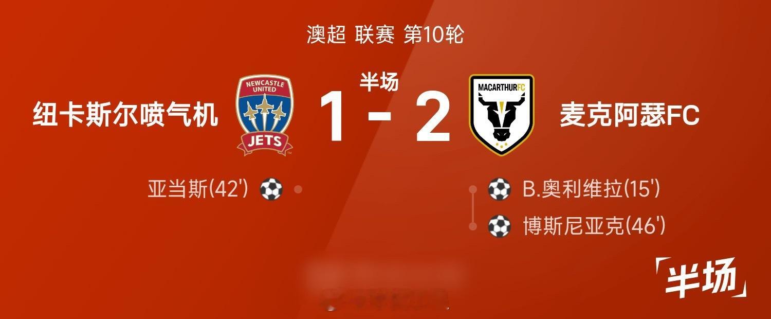 25/26赛季澳超联赛第10轮,纽卡斯尔喷气机迎战麦克阿瑟FC。半场战罢,双方比分暂为纽卡斯尔喷气机1-2麦克阿瑟FC,亚当斯、B.奥利维拉、博斯尼亚克破门建功。