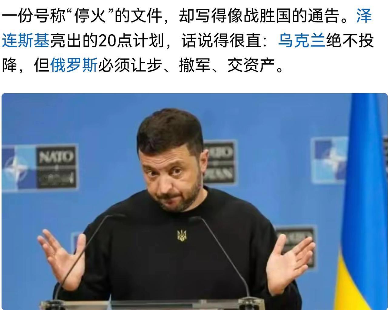 泥鳅般的泽连斯基用白蚁掏洞战术,掏空了特朗普和平计划内容。泽连斯基知道硬刚特朗普行不通,于是来了个迂回战术,嘴上说同意,暗地里联合欧洲,对特朗普版东改西改完全变成了乌克兰的昭告书。 泽版20条核心内容:领土不承认、不让步;军队必须维持80万底线;核电站必须交回来;欧洲军队进驻乌克兰;没收俄罗斯国外资产;加大对俄罗斯的全面制裁;重建资金由相关国家出;两年内接收乌克兰入欧盟;乌克兰继续寻求加入北约。 这不是在寻求停战,是对俄罗斯的新挑衅,更是对特朗普和平计划的否定,是昭告天下,乌克兰要一路走到黑。 至于俄罗斯对泽版的协议的态度,猜都不用猜,一定是拒绝。俄乌战争必将延续…泽连斯基为何多次变卦和平计划 俄罗斯会接受泽连斯基的和平计划吗 泽连斯基版“和平计划”有何关键信息 (图片来自网络)