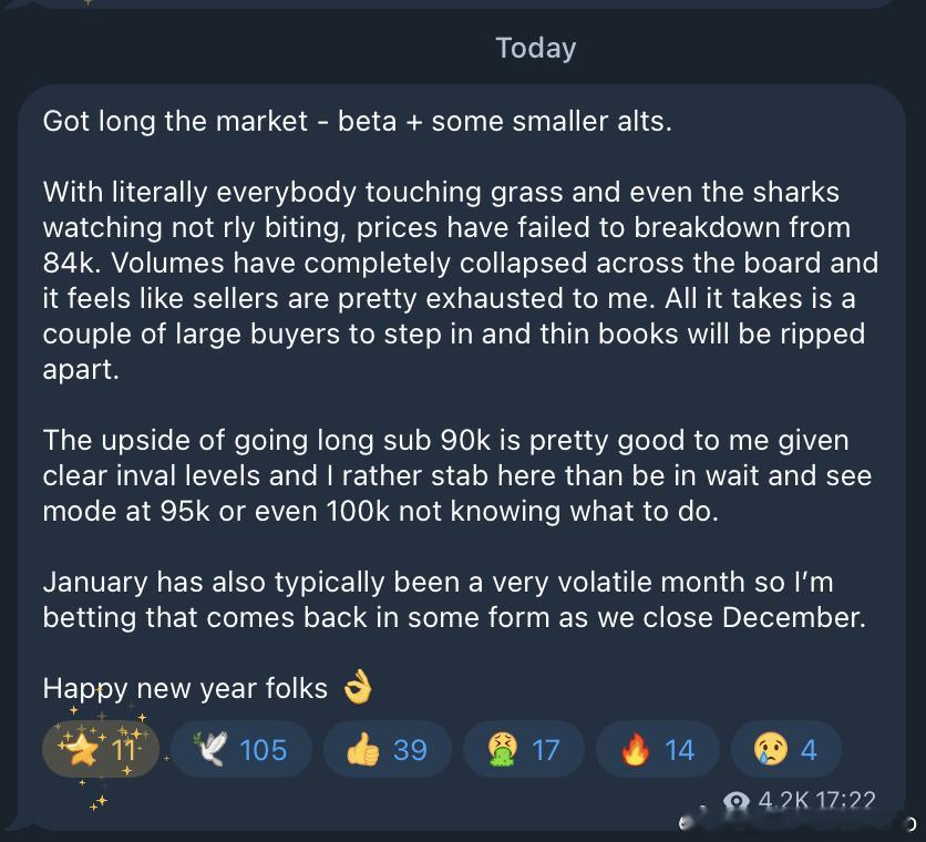 鸽子开多了他认为市场在年底缩量盘整中卖盘已经枯竭且 BTC 死守 84k 表明有坚实的支撑因此决定提前埋伏做多博弈节后资金回流轻松拉升