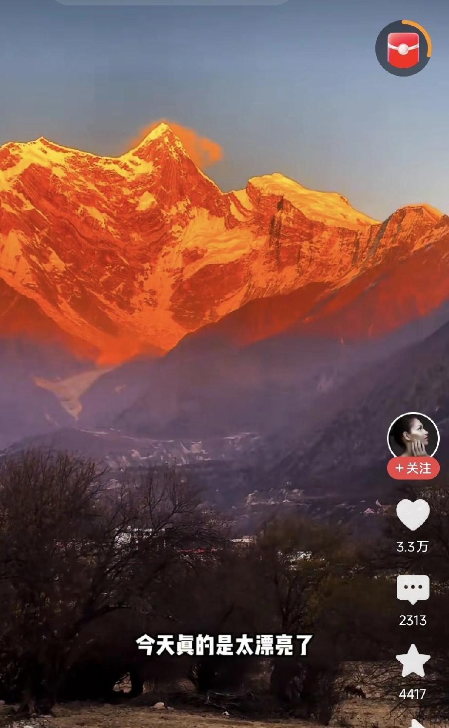 惊艳的“日照金山” 刚刚看到一个视频,真是一幅惊艳的“日照金山”画面…… 有点小激动,居然把这个视频看了两遍还不过瘾,总感觉这个画面太震惊了!记得我去西藏旅游时,导游带着我们去看南迦巴瓦峰的日照金山,来到一棵大树附近,说这里是看“日照金山”的最佳位置,当天的天气不是很好,导游指了半天,我也没有看出个所以然来,临离开都不知道哪个山峰是南迦巴瓦峰,太遗憾了……[捂脸] 尽管只是一个视频,虽然不在现场,我也很感激这位拍友,把这么美妙的时刻分享给我们大家…… 这自然界太奇妙了,同样都是我们天天见到的太阳,可照在南迦巴瓦峰上时,形成的“日照金山”画面为什么震撼呢?