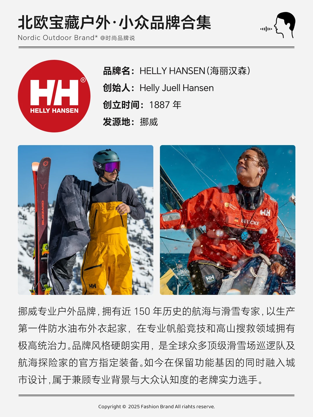 挪威百年专业户外品牌。它是全球搜救队与帆船选手的战袍。技术护城河极深,如今在维持专业度的同时,也在努力通过机能感重塑都市形象。