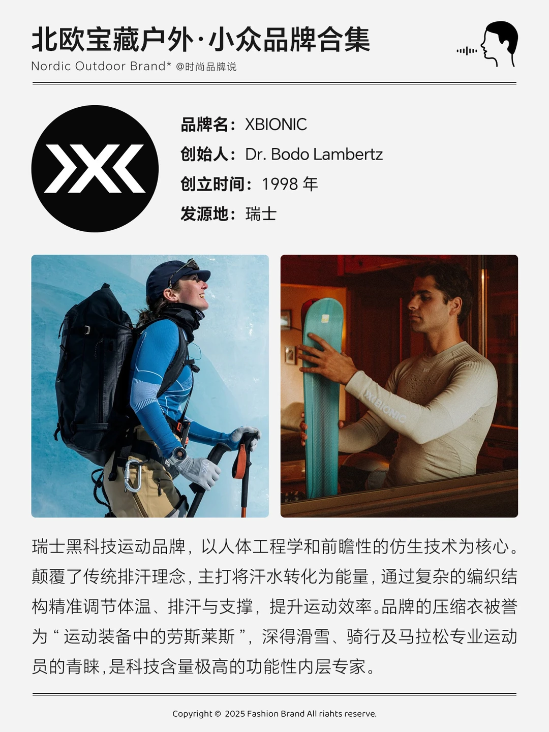 瑞士黑科技运动品牌,以人体工程学和前瞻性的仿生技术为核心。颠覆传统排汗理念,主打将汗水转化为能量,通过复杂的编织结构精准调节体温、排汗与支撑,提升运动效率。品牌的压缩衣被誉为“运动装备中的劳斯莱斯”,深得滑雪、骑行及马拉松专业运动员的青睐,是科技含量极高的功能性内层专家。