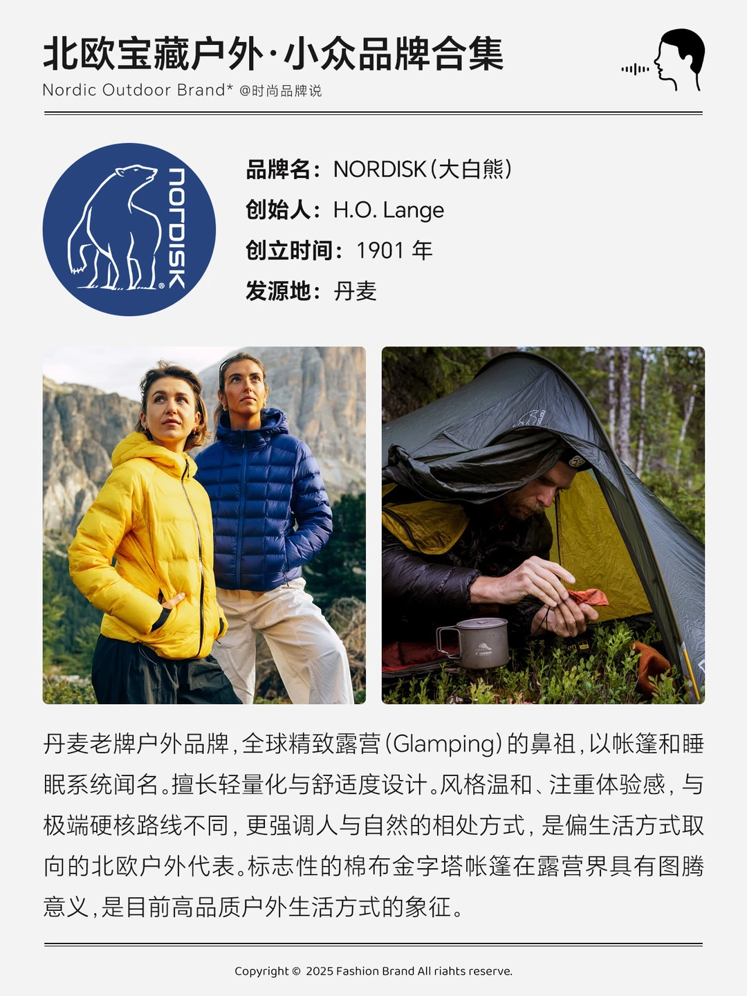 丹麦老牌户外品牌,全球精致露营先行者,以帐篷和睡眠系统闻名。风格温和、注重体验感,强调人与自然的相处方式。