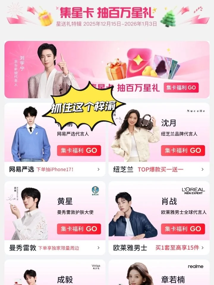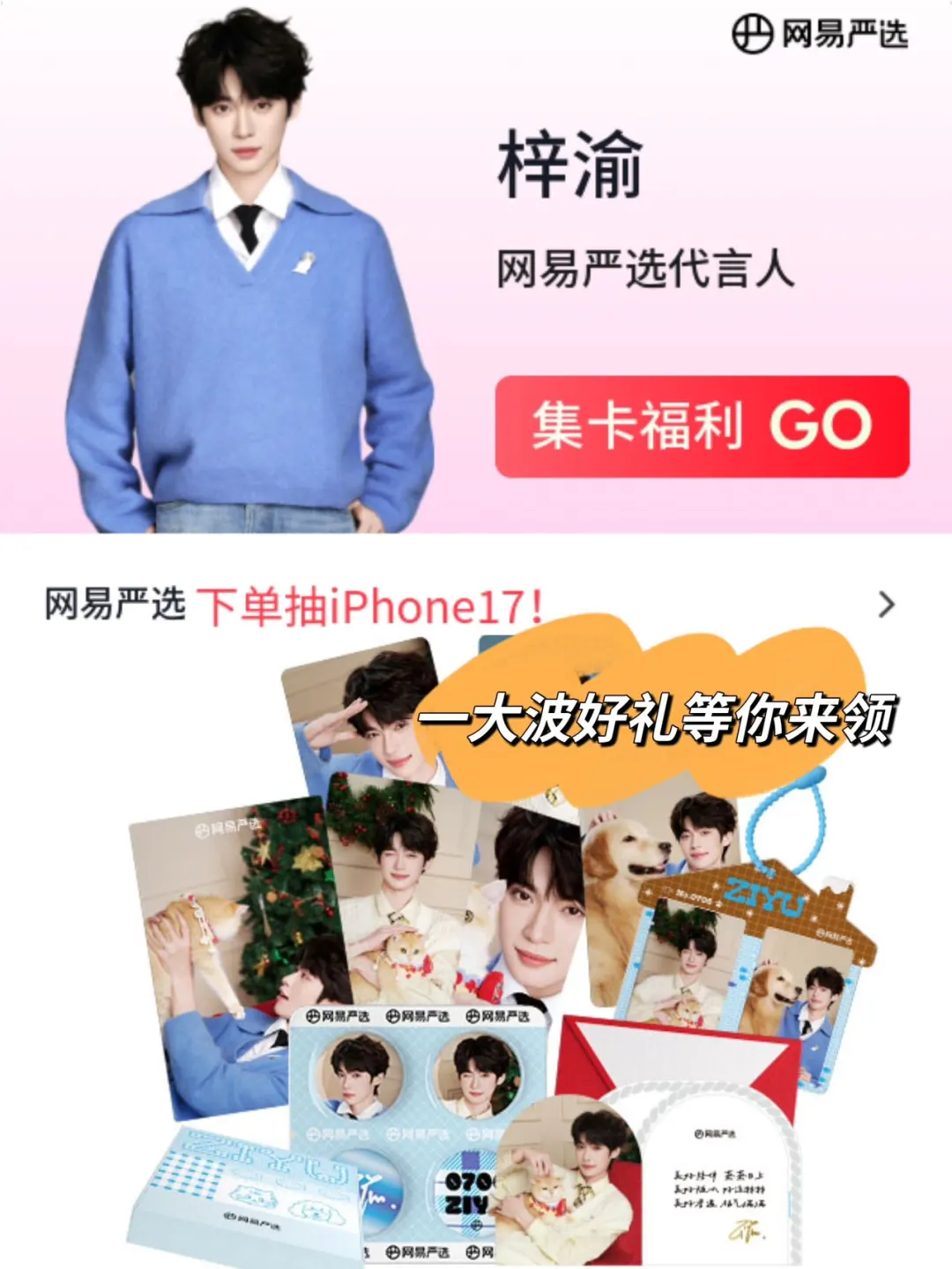 见不到他的我只能通过集卡支持了,东子已经上新了双旦活动,可以直接在里面集梓渝的卡!不仅有签名照还有专属周边好礼,直接在东子🔍【超级明星好礼】集超级星卡,就可获得网易严选鲜蒸猫粮1.5kg、梓渝亲签、明信片等,至高抽2026元红包,四舍五入为梓渝给我发红包了哈哈哈,关键下单还可抽iphone17,完全忍不住要剁手了!一想到可以和星卡里的梓渝贴贴就好兴奋,梓渝继续走花路,我为你举大旗[派对R]