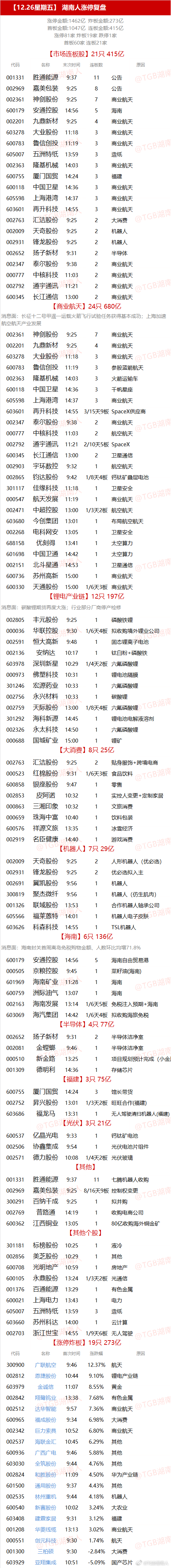 【12.26星期五】 湖南人涨停复盘 "涨停金额:1462亿 炸板金额:273亿首板金额:1047亿 连板金额:415亿涨停81家 炸板19家 跌停1家首板60家 连板21家" 【市场连板股】21只 415亿 代码 名称 末次时间 连板数 原因001331 胜通能源 9:37 11 公告002969 嘉美包装 9:25 8 公告002361 神剑股份 9:25 7 商业航天600179 安通控股 14:56 5 海南002201 九鼎新材 9:25 4 商业航天603278 大业股份 11:18 3 商业航天600783 鲁信创投 11:19 3 商业航天605007 五洲特纸 13:59 3 造纸002363 隆基机械 14:03 3 商业航天600755 厦门国贸 14:24 3 福建600118 中国卫星 14:36 3 商业航天605598 上海港湾 14:37 3 商业航天603601 再升科技 14:55 3 商业航天002763 汇洁股份 9:25 2 大消费002009 天奇股份 9:25 2 机器人002931 锋龙股份 9:25 2 机器人002652 扬子新材 9:31 2 半导体002347 泰尔股份 9:38 2 商业航天000777 中核科技 11:03 2 商业航天002792 通宇通讯 11:21 2 商业航天600345 长江通信 13:00 2 商业航天【商业航天】24只 680亿 消息面:长征十二号甲遥一运载火箭飞行试验任务获得基本成功;上海加速航空航天产业发展 002361 神剑股份 9:25 7 商业航天002201 九鼎新材 9:25 4 商业航天603278 大业股份 11:18 3 商业航天600783 鲁信创投 11:19 3 参股蓝箭航天002363 隆基机械 14:03 3 火箭运输车600118 中国卫星 14:36 3 千帆星座605598 上海港湾 14:37 3 商业航天603601 再升科技 14:55 3/15天9板 SpaceX供应商002347 泰尔股份 9:38 2 商业航天000777 中核科技 11:03 2 航空航天002792 通宇通讯 11:21 2/10天5板 SpaceX600345 长江通信 13:00 2 卫星通信002903 宇环数控 9:32 1 航空航天002865 钧达股份 9:42 1/8天4板 钙钛矿叠层电池301117 佳缘科技 11:18 1 卫星安全000547 航天发展 11:19 1 商业航天002471 中超控股 13:00 1/3天2板 航空航天603680 今创集团 13:01 1 布局航空航天002268 电科网安 13:05 1 卫星安全688158 优刻得 13:41 1 太空算力601698 中国卫通 14:42 1 太空算力002151 北斗星通 14:53 1 卫星通信600736 苏州高新 15:00 1 商业航天600330 天通股份 15:00 1/6天3板 商业航天【锂电产业链】12只 197亿 消息面:碳酸锂期货再度大涨;行业部分厂商停产检修 002805 丰元股份 9:25 1 磷酸铁锂000036 华联控股 9:30 1/6天4板 拟收购境外锂业公司002591 恒大高新 9:48 1 固态锂离子电池002136 安纳达 10:17 1 钛白粉+磷酸铁603978 深圳新星 10:29 1/4天2板 六氟磷酸锂000973 佛塑科技 10:31 1 锂电池隔膜301246 宏源药业 10:33 1 六氟磷酸锂002756 永兴材料 10:33 1 碳酸锂002759 天际股份 13:00 1/8天4板 六氟磷酸锂301292 海科新源 14:45 1 锂电池电解液溶剂002326 永太科技 14:50 1 六氟磷酸锂000688 国城矿业 15:00 1 锂矿【大消费】8只 25亿 002763 汇洁股份 9:25 2 贴身服饰+跨境电商000523 红棉股份 9:31 1/6天3板 食品饮料600858 银座股份 9:47 1 零售002853 皮阿诺 10:32 1 实控人变更+定制家居000863 三湘印象 10:32 1 文旅消费000659 珠海中富 10:40 1 饮料包装600576 祥源文旅 13:35 1 冰雪经济002919 名臣健康 14:40 1 游戏消费【机器人】7只 29亿 002009 天奇股份 9:25 2 人形机器人(优必选)002931 锋龙股份 9:25 2 优必选拟入主002691 冀凯股份 9:56 1 机器人300819 聚杰微纤 9:56 1 机器人(仿生肌肉)001326 联域股份 13:53 1 合作机器人轴承公司605566 福莱蒽特 14:01 1 机器人电子皮肤603626 科森科技 14:55 1 TSL机器人【海南】6只 136亿 消息面:海南封关首周离岛免税购物金额、人数环比均增71.8% 600179 安通控股 14:56 5 海南自由贸易港000505 京粮控股 9:45 1 菜籽油(海南)601969 海南矿业 11:28 1 海南600759 洲际油气 13:07 1 海南002163 海南发展 13:14 1/6天5板 免税注入预期+海南603069 海汽集团 14:42 1/6天4板 拟收购海旅免税【半导体】4只 77亿 002652 扬子新材 9:31 2 半导体洁净室002081 金螳螂 9:46 1 半导体洁净室000510 新金路 13:25 1 项目规划预计完成(小金属)001309 德明利 14:36 1 存储芯片【福建】3只 75亿 600755 厦门国贸 14:24 3 馆长带货002752 昇兴股份 13:01 1/3天2板 旺旺合作(福建)603686 福龙马 13:31 1 无人驾驶清扫机器人(福建)【光伏】3只 21亿 600537 亿晶光电 9:33 1 钙钛矿电池002506 协鑫集成 9:54 1 光伏电池片组件002571 德力股份 10:08 1/4天2板 光伏玻璃【其他】 001331 胜通能源 9:37 11 七腾机器人收购002969 嘉美包装 9:25 8/16天9板 控制权变更300291 百纳千成 9:25 1 拟并购002769 普路通 14:19 1 收购电商公司600362 江西铜业 13:05 1 80亿收购海外铜金矿【其他个股】 301181 标榜股份 10:25 1 液冷002856 美芝股份 10:29 1 其他600708 光明地产 10:59 1 房地产600105 永鼎股份 13:24 1/3天2板 光通信001376 百通能源 13:29 1 有色金属600021 上海电力 13:43 1 电力605007 五洲特纸 13:59 3 造纸603660 苏州科达 14:00 1 云计算002703 浙江世宝 14:55 1/9天6板 无人驾驶【涨停炸板】19只 273亿 代码 名称 首次时间 涨跌幅 原因300900 广联航空 9:46 12.37% 航天002812 恩捷股份 10:44 9.10% 锂电产业链603979 金诚信 11:07 8.55% 黄金002842 翔鹭钨业 13:38 7.68% 有色金属002512 达华智能 9:57 7.36% 商业航天600965 福成股份 9:34 6.98% 大消费002342 巨力索具 10:52 6.80% 商业航天002537 海联金汇 10:45 6.29% 其他600936 广西广电 9:46 5.88% 其他603030 全筑股份 9:44 4.76% 其他002824 和胜股份 11:09 4.50% 华为产业链601500 通用股份 9:37 4.43% 其他002535 林州重机 9:44 4.18% 机器人600540 新赛股份 10:02 3.24% 大农业603408 建霖家居 9:31 3.12% 福建001208 华菱线缆 13:13 3.02% 商业航天000551 创元科技 9:30 1.74% 航天001300 三柏硕 9:30 -2.84% 大消费603929 亚翔集成 10:51 -5.09% 国产芯片