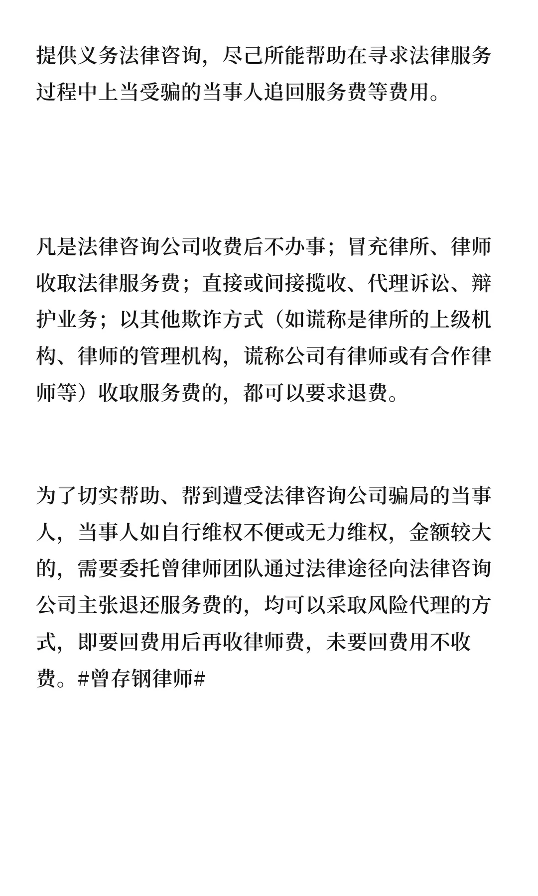 为了切实帮助、帮到遭受法律咨询公司骗局的当事人,当事人如自行维权不便或无力维权,金额较大的,需要委托曾律师团队通过法律途径向法律咨询公司主张退还服务费的,均可以采取风险代理的方式,即要回费用后再收律师费,未要回费用不收费。