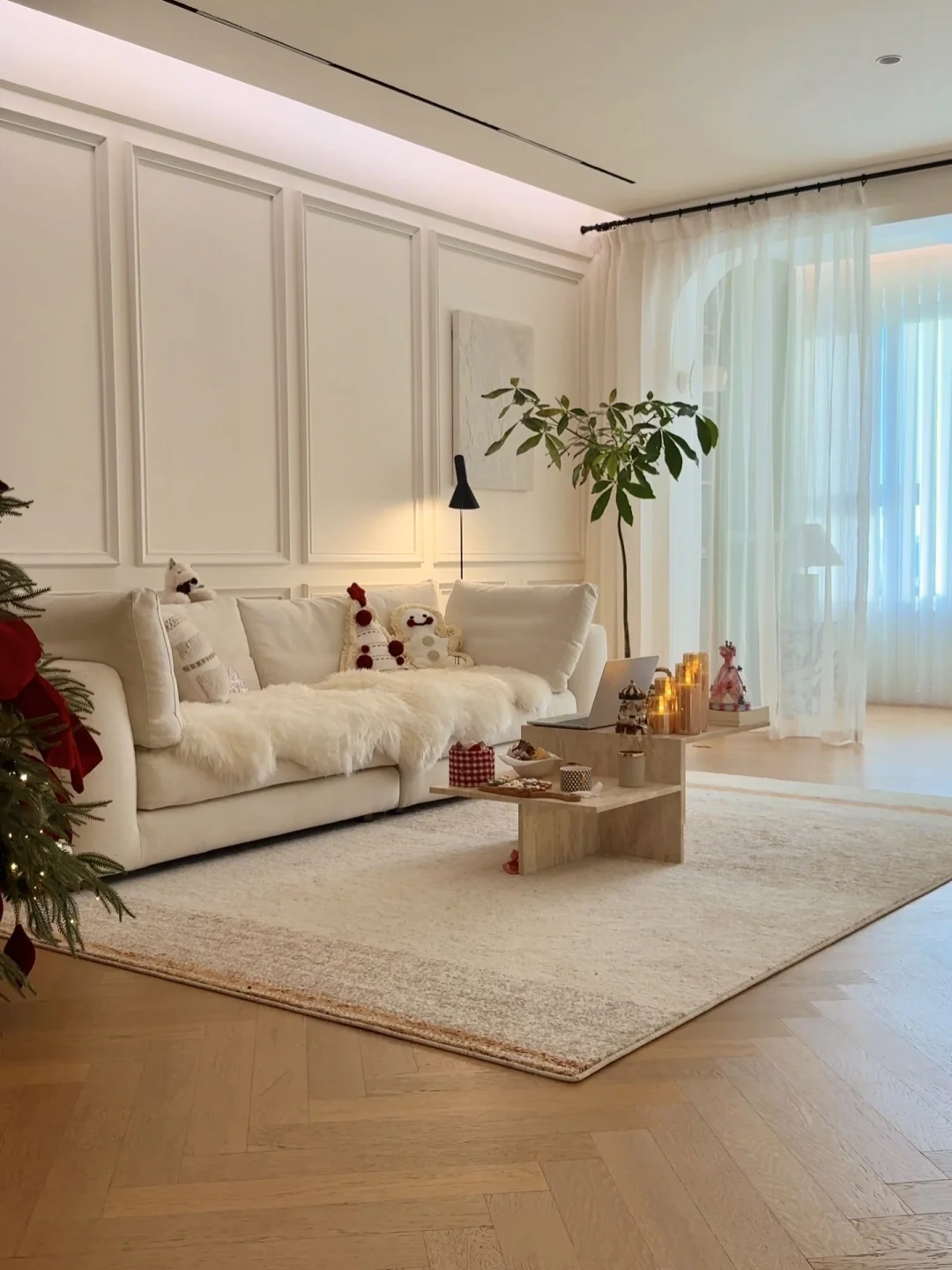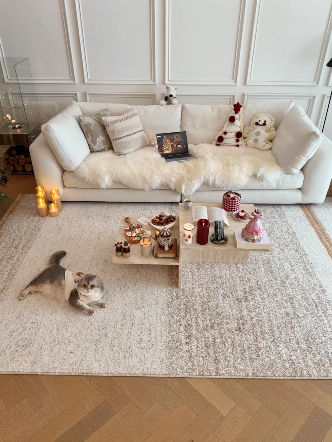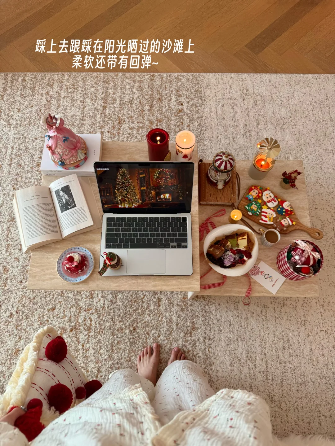 ▫️说说它的"舒适感"🤩平时躺在地毯上看电视剧也很不错~洞石茶几摆着下午茶🍰一边吃一边追剧温馨感直接拉满!朋友来家里都说这地毯选得有品味,既衬得起圣诞的热闹,平时看也高级感满满🎊