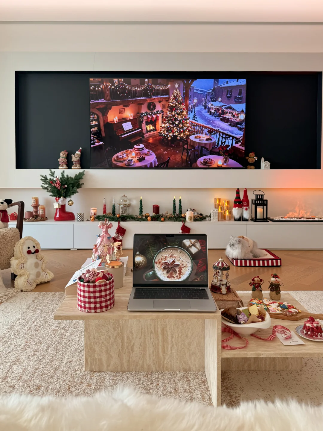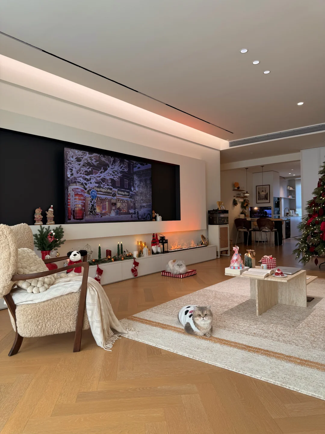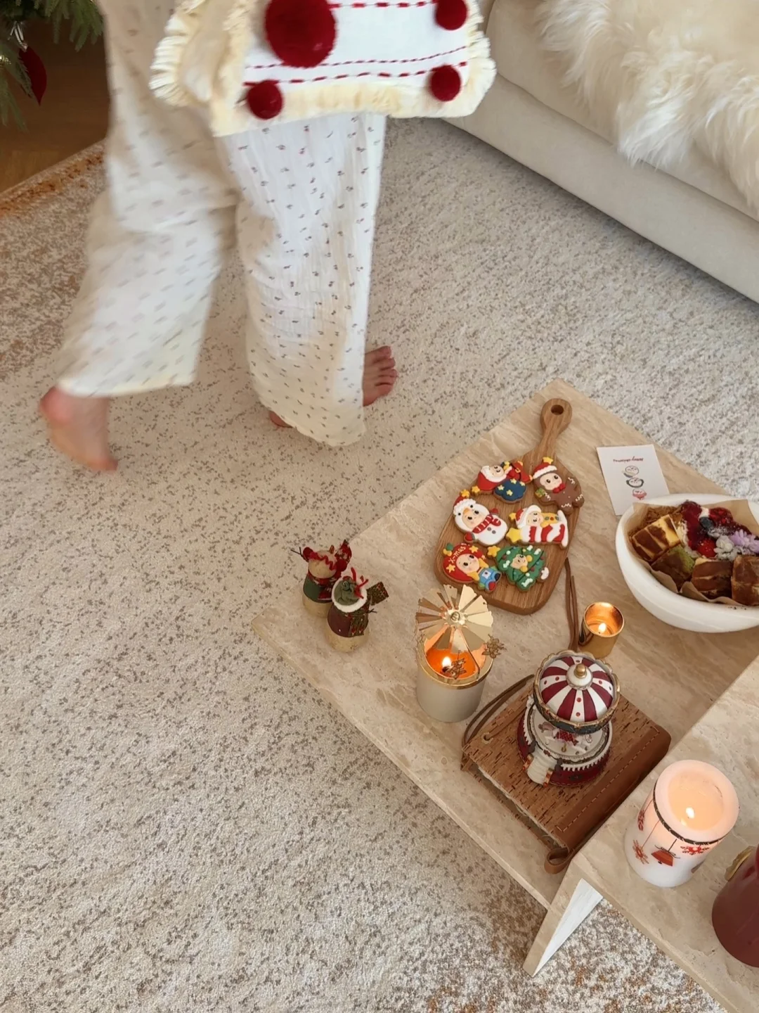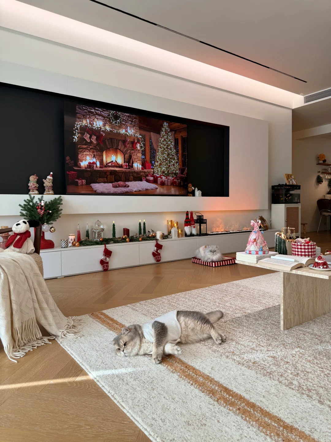 ▫️说说它的"舒适感"🤩平时躺在地毯上看电视剧也很不错~洞石茶几摆着下午茶🍰一边吃一边追剧温馨感直接拉满!朋友来家里都说这地毯选得有品味,既衬得起圣诞的热闹,平时看也高级感满满🎊