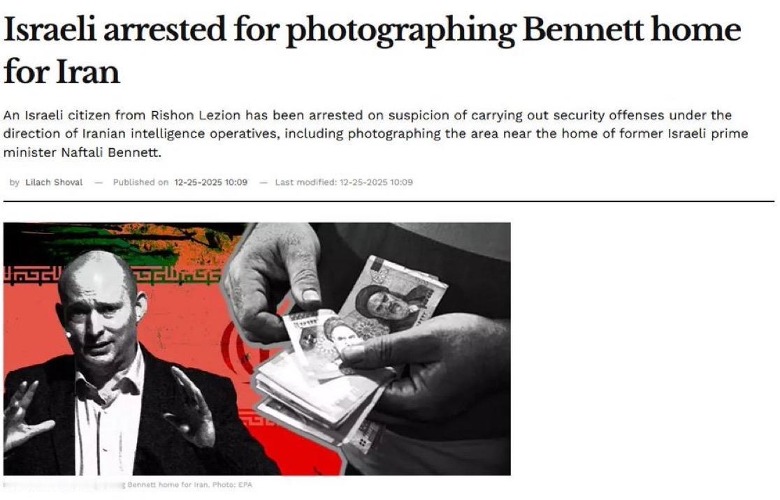 以色列安全机构辛贝特逮捕了一名来自里雄莱锡安的以色列公民,怀疑其在伊朗情报人员的指示下实施安全犯罪,包括在以色列前总理纳夫塔利·贝内特的住所附近执行“监视任务”。