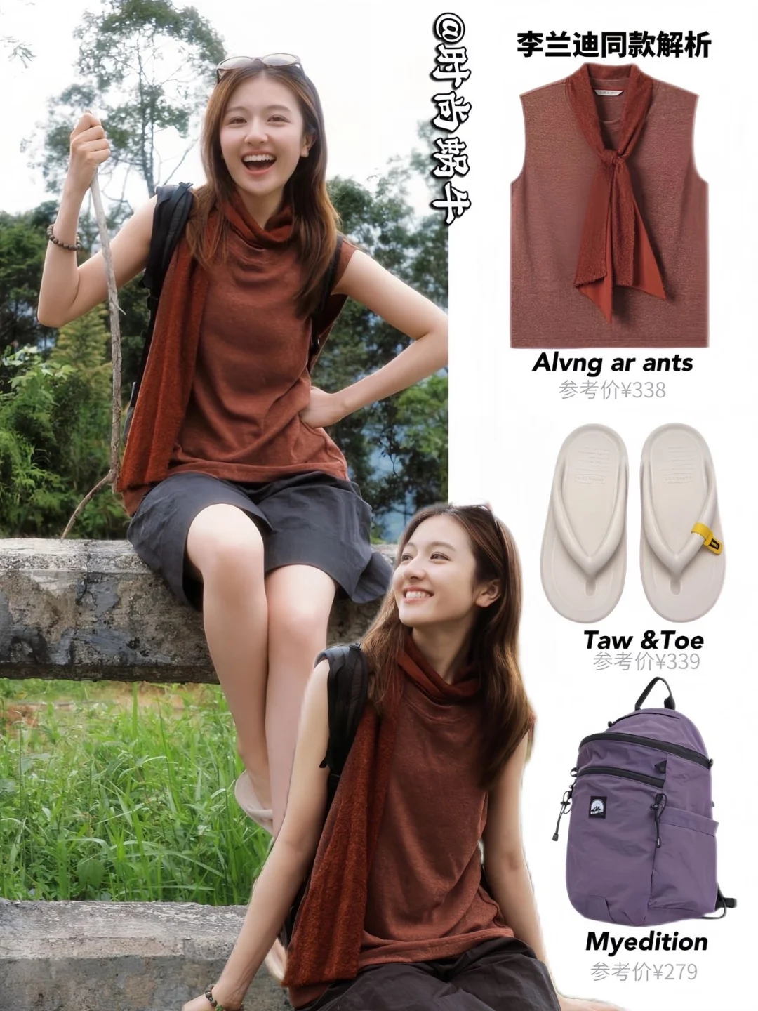 山林间的溪流绕着青石路,新中式上衣配牛仔喇叭裤,把国风温婉和休闲随性揉进山野的风