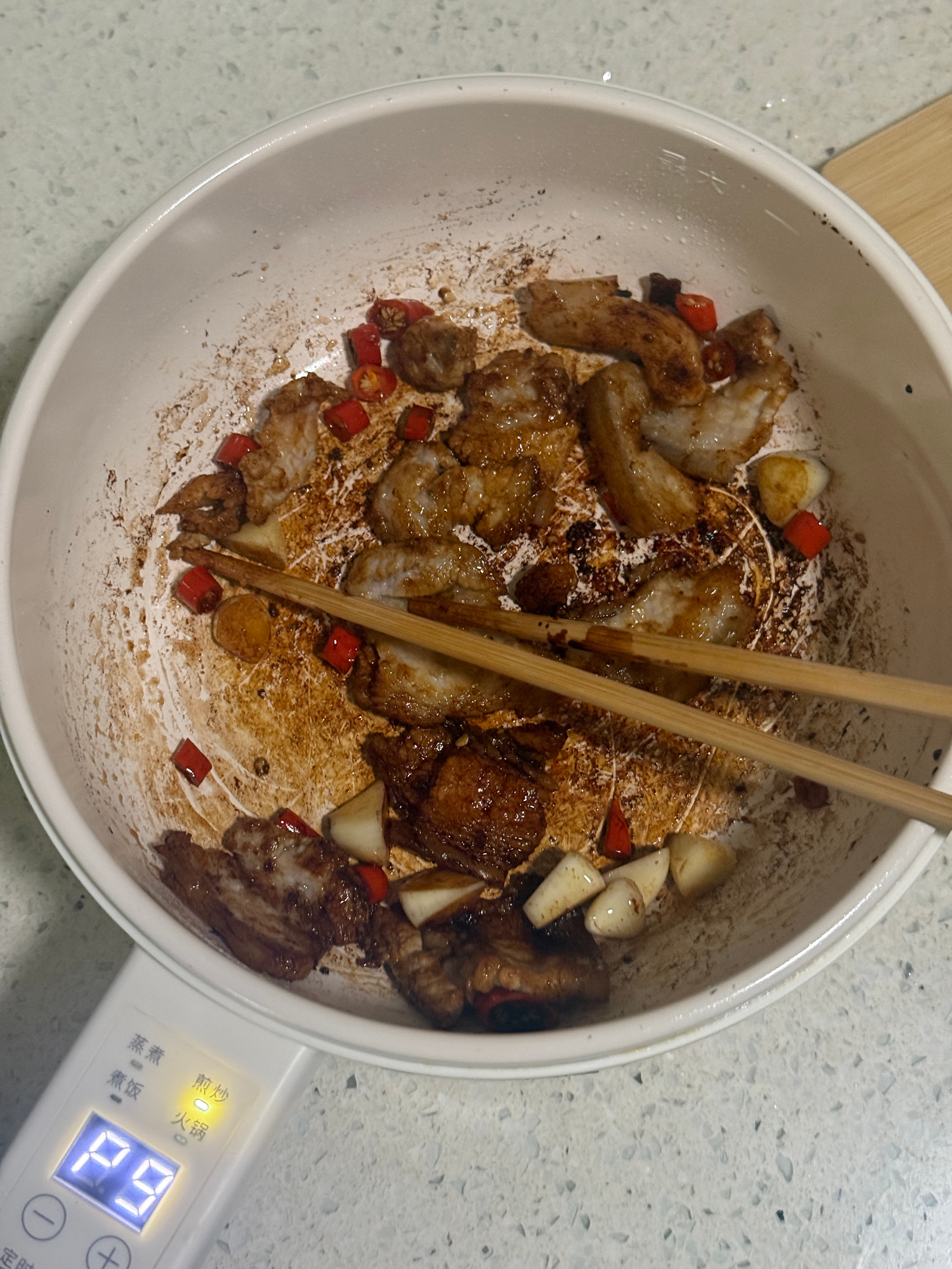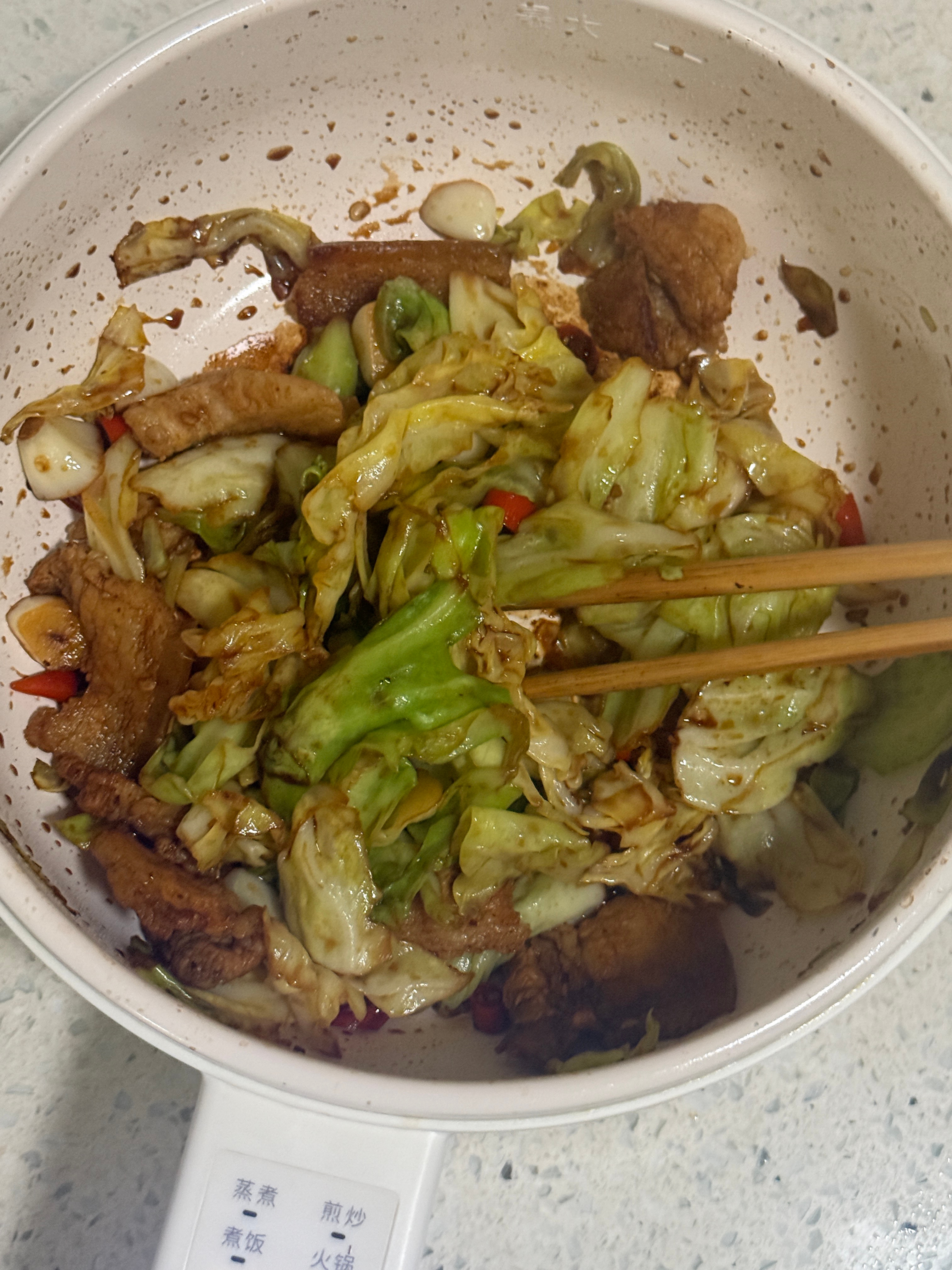 自力更生 开始下厨了!🧑🍳切了点五花肉炒了包菜貌似老抽加的有点多…还有就是这个锅底为啥煎了肉就粘啊?锅的问题吗?卷妹的唠嗑今天小卷长胖了吗