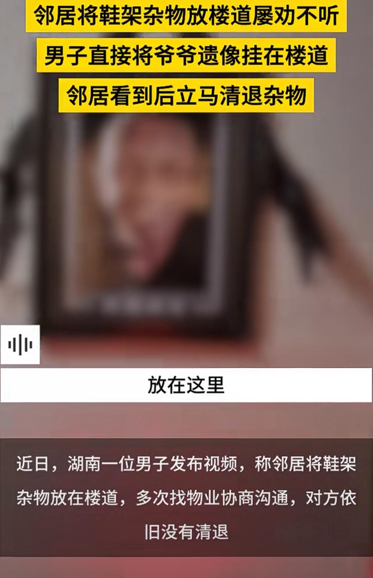 这种劝退方法太绝了![捂脸] 近日广东网友成功劝退领居在公共区域门口的鞋架子! 邻居将鞋架杂物放楼道屡劝不听,男子直接将爷爷遗像挂在楼道,邻居看到后立马清退杂物。 男子吐槽:“既然门口这一堆乱七八糟的东西没人管得了,那我放一张我爷爷的遗像照片,也不能有人管得了我。” 果然选对方法很重要,没等多久,领居果断清空鞋柜,并拍视频证明表示暂时性撤退,实在是打不过。[呲牙] 爷爷心想我都走了,还的出来给你解决问题![赞] 网友表示我爷爷还在,估计的下辈子能收拾他。