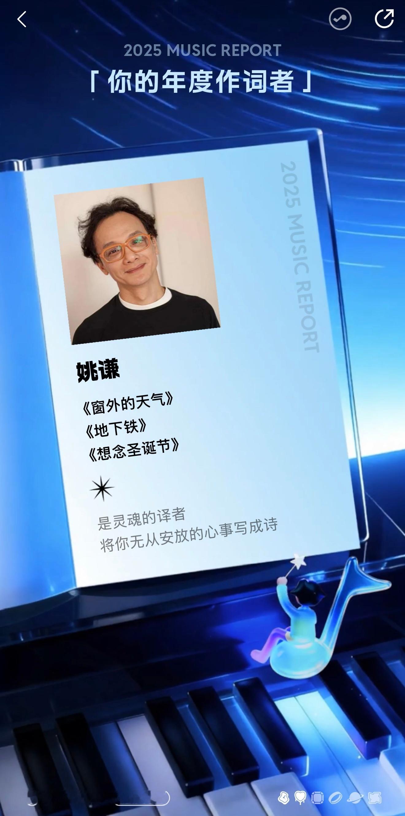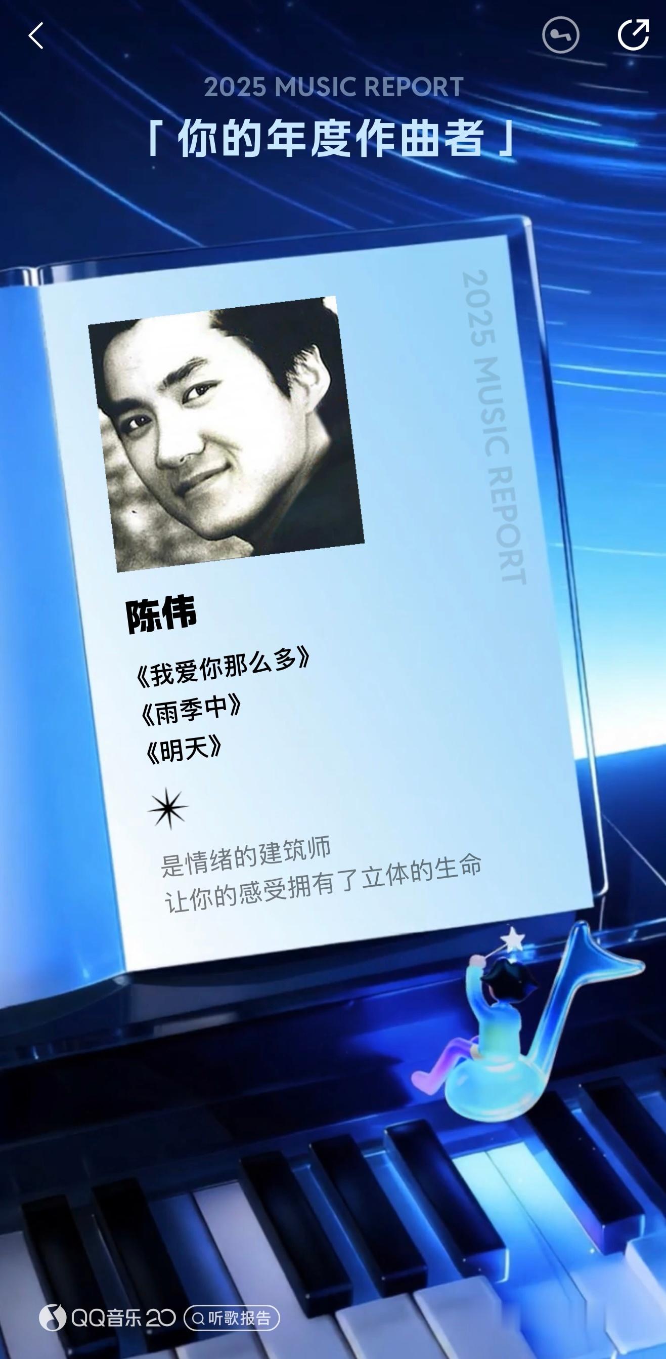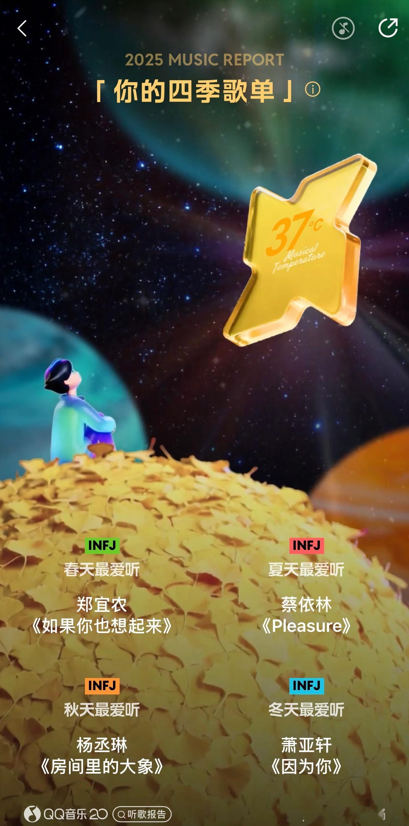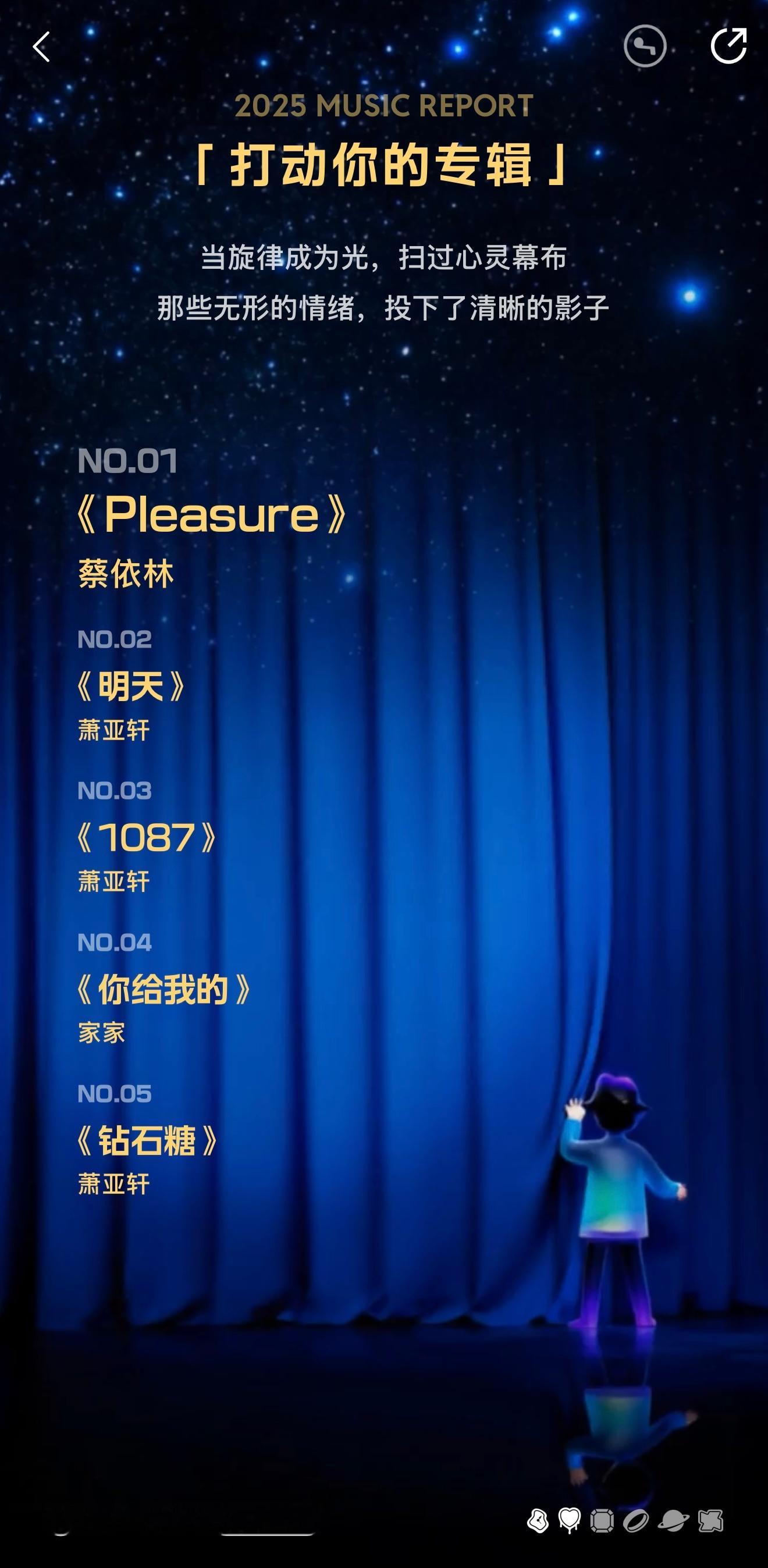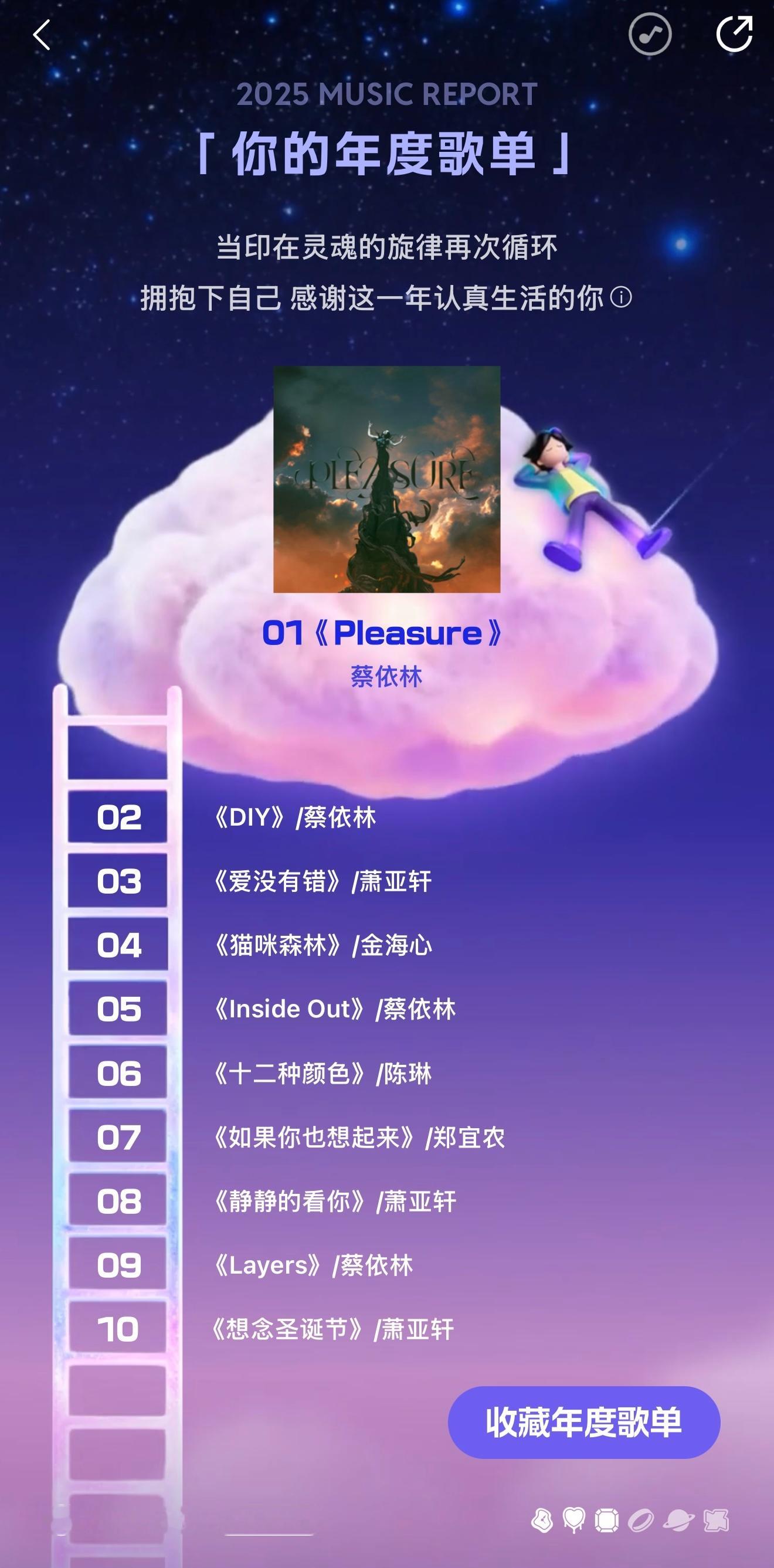 每年听来听去还是这些人,年度歌手必须是萧亚轩,就连年度作词作曲都是姚谦和陈伟,今年的年度专辑也必然是蔡依林的《Pleasure》,最喜欢开车的时候放这张。QQ音乐年度听歌报告