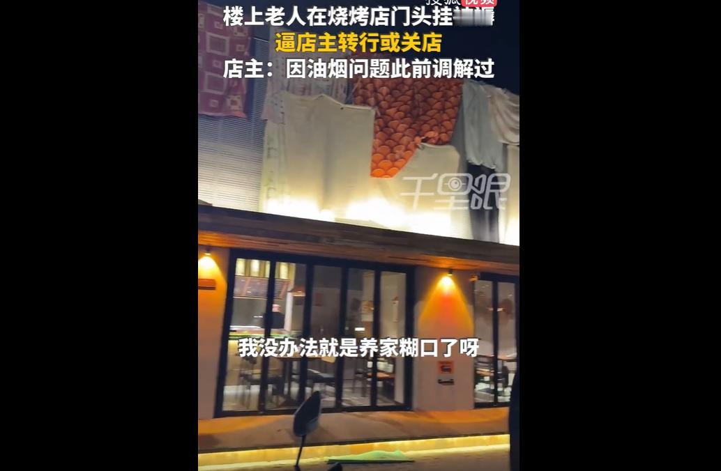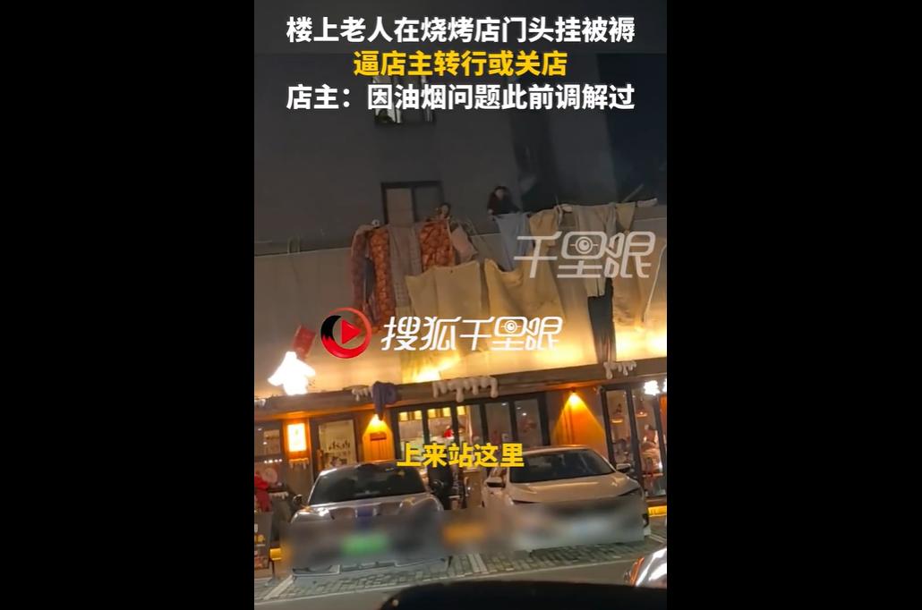 12月25日,浙江嘉兴一烧烤店因油烟问题与楼上住户产生纠纷,楼上老人持续一个多月在店铺门头悬挂被褥、床单,还多次泼水、砸门头、辱骂顾客。 说真的,老人住在楼上,年纪大了对油烟、噪音都是特别敏感,烧烤店的油烟飘进家里,味大到呛人,晚上顾客喧哗还影响休息,长期下来谁受得了? 老人看似极端的行为,说白了就是被折磨得没辙了的反击! 不过,烧烤店的选址也有问题! 明知道是商住混合楼,楼下开店楼上住人,还敢开烧烤这种重油烟、易扰民的店,这不是故意给邻里添堵吗? 就算装了油烟净化设备,难免有疏漏,更何况没有地下排烟管,整改都没头绪,当初选址时怎么不想想会影响住户? 只顾着自己赚钱,完全无视楼上居民的生活,这种只顾利益不顾他人的选址,本身就藏着纠纷的隐患,说白了就是不负责任!