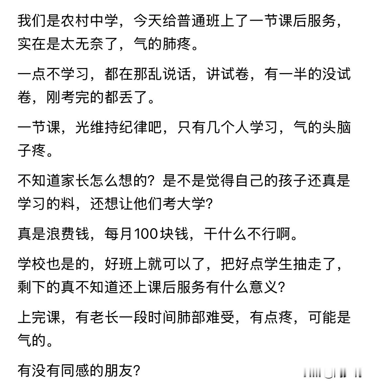 “被学生气得肺疼!”一位农村中学教师发文吐槽:“给普通班上了一节课后服务,实在是太无奈了,气的肺疼。一点不学习,要么在乱说话,要么把刚考完的试卷都丢了。一节课下来,光维持纪律了。真是浪费100块钱,学校也是的,好班上就可以了,把好点学生抽走了,剩下的真不知道还上课后服务有什么意义? 此话一出,有网友当即表示:“现在很多课后服务,对部分孩子来说,就是换个地方聊天。” 也有网友坦言:“老师被当保姆用,既要管纪律,又要被要求出成绩,太难了。” 这事在周少看来,这一堂令人气闷的课,暴露的远不止纪律问题。 它像一面镜子,映照出乡村教育中部分学生“学习习惯断裂”与“目标感丧失”的深层困境。当知识基础薄弱、行为习惯未养成与青春期迷茫叠加,课堂便极易失控。 然而,气恼之余更需理性思考:教育的目标并非只是培养“大学生”,更是塑造“健全的人”。对于这些孩子,或许我们首先需要的不是灌输知识,而是重建规矩、激发动力,甚至帮助他们看见学业之外的出路。 家长、学校与社会,或应更务实评估孩子现状,共同寻找那条“虽不顶尖但可前行”的道路。教育的温度,正体现在对“普通大多数”不放弃的探索与努力中。#寻美三湘# #长沙新朋友#