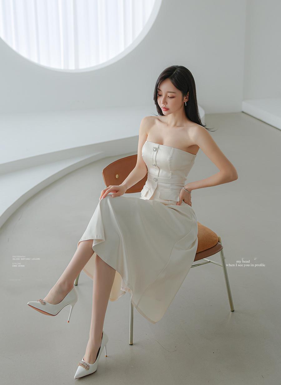孙允珠-一个穿白色连衣裙的女士站在明亮的房间里。每日摄影分享简单穿搭好看吗