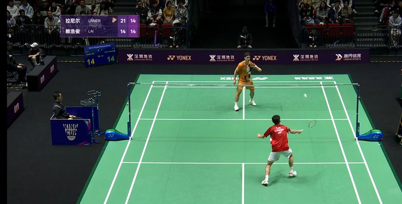 法国小将拉尼尔2-0击败加拿大新秀赖浩俊,晋级下一轮 2025年天王杯首轮 世界第8的法国小将拉尼尔在体能和经验上明显占优,特别是在第二局比分落后的情况下,不急不慌,耐心与赖浩俊拉吊,机会出来就突击杀球,在局末阶段才追平比分19-19,凭借体能优势再下两分带走比赛,最后以2 - 0(21-14, 21-19)击败加拿大新秀赖浩俊,晋级下一轮。