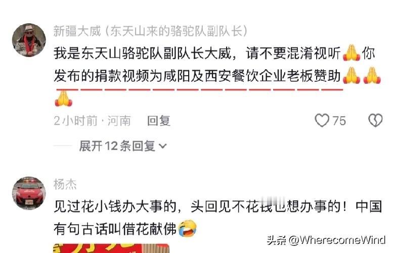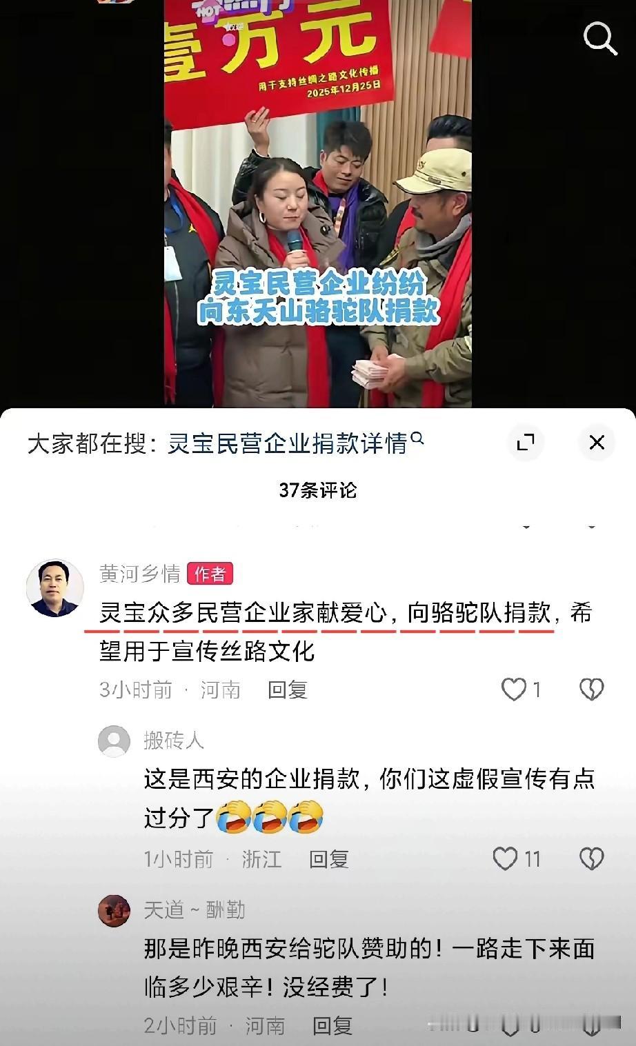 灵宝众多民营企业家献爱心, 向驼队捐款。 这是一位河南网友发的帖子, 却配上了咸阳和西安爱心人士捐款的图 不明真相的人, 肯定相信是河南民营企业家献的爱心, 因为26号,驼队正在河南灵宝, 怎么可能在西安? 东天山驼队副队长看到此文, 立即澄清事实真相, 强调, 是陕西咸阳和西安的餐饮人士的捐款, 非灵宝民营企业家,以正视听。 可怜的某地网友, 为给自己脸上贴金, 自己拿不出真金白银, 却要把别人的捐款, 说成是自己的捐款。 这是什么心态? 难道是习惯吗?
