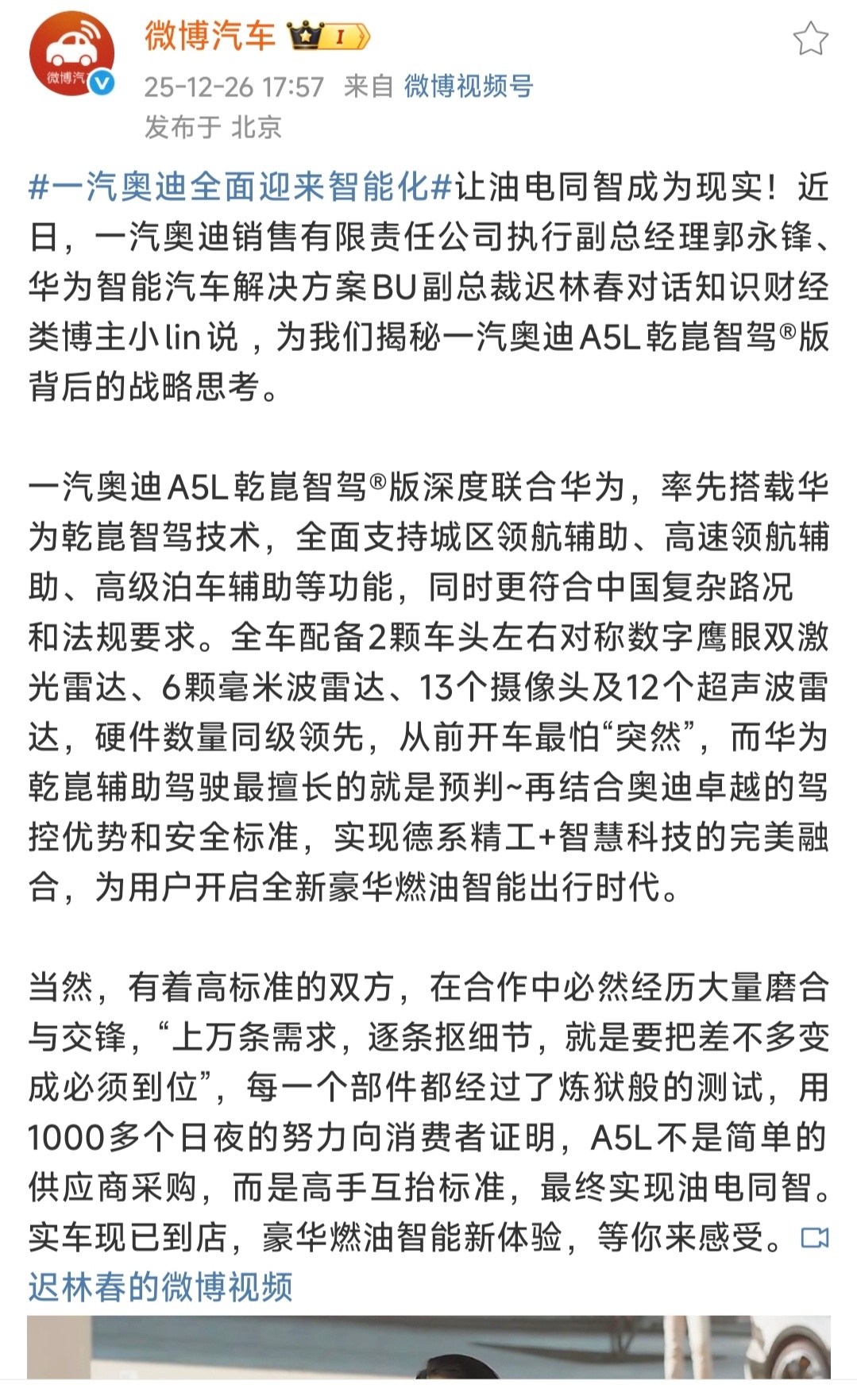 一汽奥迪全面迎来智能化每次看传统车企宣发说全面智驾化,全面智舱化都很无奈。首先从内部动作来说,这是值得鼓励的,是终于有牌能反击新势力的好棋,是打破消费者“”合资做不好双智”刻板印象的重要机会。但是从观众视角说,“全面”这个词又显得很假,因为A6,Q5,A3,Q3等还有大批准备换代,或短期不换代,或准备停售的老车,依旧在承担双智不及新势力的压力。而且,其中不乏没有投华,双智还打不赢A5L的车型。一个品牌十几款在售车,只有一款车在双智方面赶上新势力水平了,这能叫“全面智能化”吗还是等其他双智车陆续上市或换代了,再说“全面”比较好大v聊车