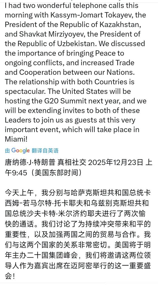 特朗普在个人的社交媒体上突然公布,他与哈萨克斯坦与乌兹别克斯坦的总统分别进行了电