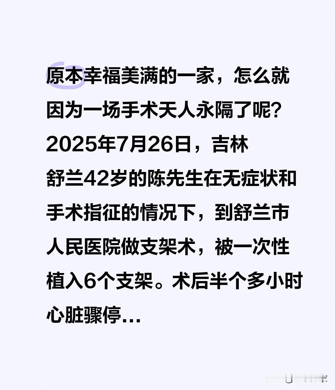 原本幸福美满的一家,怎么就因为一场手术天人永隔了呢?2025年7月26日,吉林舒兰42岁的陈先生在无症状和手术指征的情况下,到舒兰市人民医院做支架术,被一次性植入6个支架。术后半个多小时心脏骤停,虽经抢救,8天后还是去世了。家属称术前多次接到院方催做手术电话,医生还说多1个多活10年。此前2024年11月他曾植入1个支架,术后恢复正常生活。事后鉴定医方有过错,但因患者本身疾病严重,双方责任对等。这背后到底是医疗失误还是另有隐情?医疗鉴定是否公正?患者术前被催手术又该如何解释? 心脏支架手术 支架手术