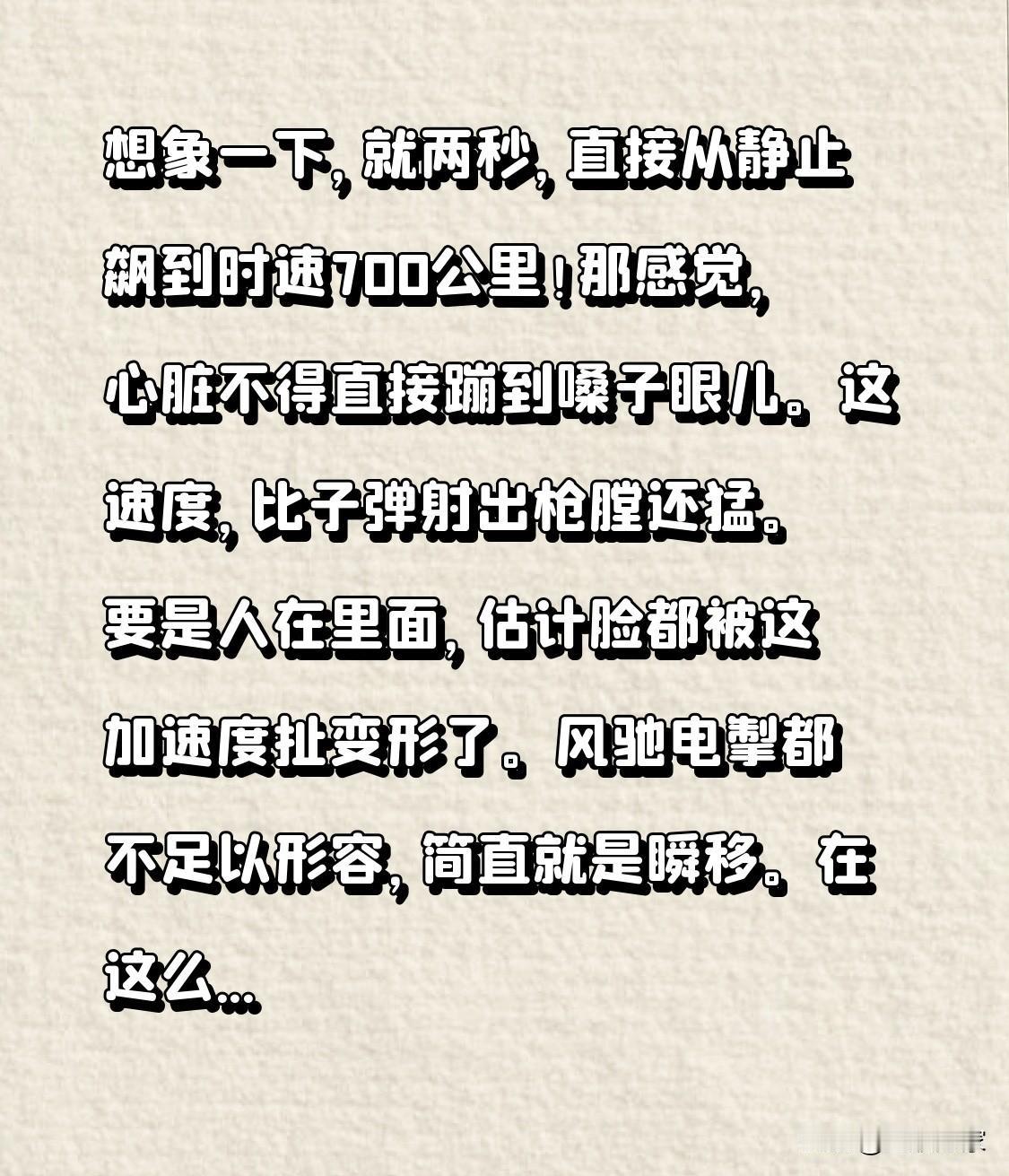 想象一下,就两秒,直接从静止飙到时速700公里!那感觉,心脏不得直接蹦到嗓子眼儿。这速度,比子弹射出枪膛还猛。要是人在里面,估计脸都被这加速度扯变形了。风驰电掣都不足以形容,简直就是瞬移。在这么短时间达到这速度,得是多么强大的动力系统。这要是在赛场上,其他选手估计只能看到一道残影。 这速度现实中真能实现吗?要是能,又会用在什么领域?如此高速又要怎么控制和保障安全? 速度 4分钟生死时速 人类最高时速 电影生死时速 车速飞跃 极速100米 人类速度天花板 全球速度大比拼 f1速度 极速100米 人类速度天花板 全球速度大比拼 公里速度 人类速度极限 40公里极速