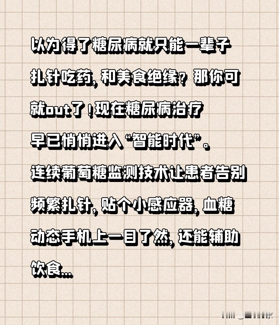以为得了糖尿病就只能一辈子扎针吃药,和美食绝缘?那你可就out了!现在糖尿病治疗早已悄悄进入“智能时代”。连续葡萄糖监测技术让患者告别频繁扎针,贴个小感应器,血糖动态手机上一目了然,还能辅助饮食和用药调整。智能胰岛素泵更是厉害,能自动调整用量,形成闭环系统,还能手机远程操控。而且国家医保也给力,不少智能设备能报销,基层也在大力普及。 不过,这“智能时代”也不是十全十美,设备成本、数据安全等都是问题。你觉得糖尿病治疗的“智能时代”会全面普及吗?你愿意尝试这些智能设备吗?对于糖尿病治疗的未来,你有什么期待? 糖尿病 糖尿病控糖误区 糖尿病指数 糖尿病 糖尿病控糖 糖尿病控糖方法 糖尿病综合症 糖尿病逆转测试 糖尿病控糖方法 糖尿病综合症 糖尿病逆转测试 糖尿病下肢麻木 糖尿病控酸 糖尿病视网病变 无症状糖尿病