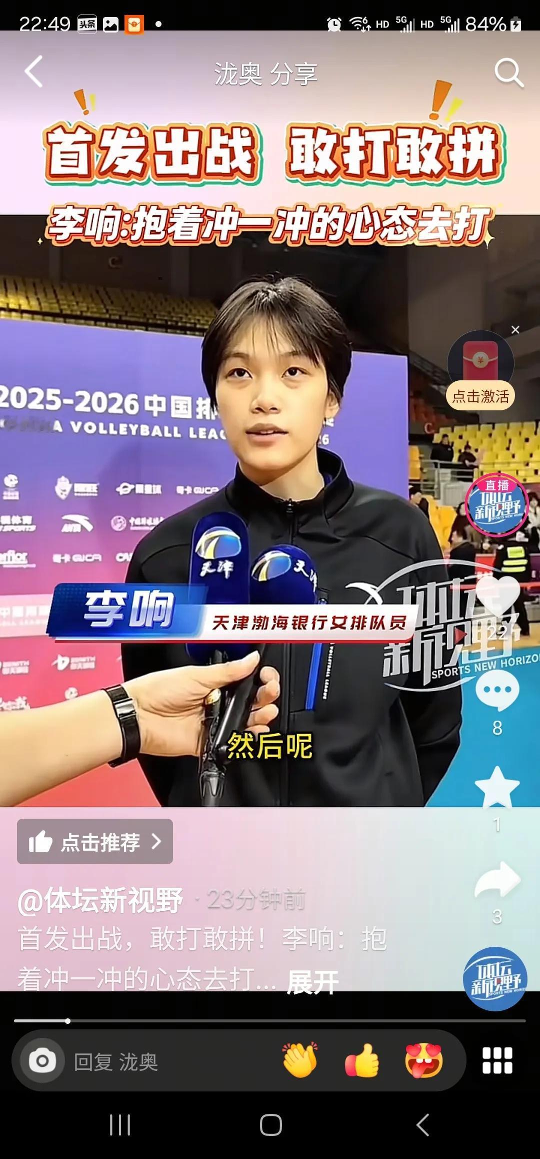 [[碰拳][加油]谁怕谁呀!天女破除迷信,放手冲击对方![碰拳][加油]] “不是冤家不聚头”。明天(27日)下午3点半,排超联赛天津女排主场VS上海女排。 有人说,上海女排队伍豪华,双外援,开赛以來4战全胜,积12分排名第一。天津女排正处在新老交替“底谷期,在上海队面前将不堪一击,胜算一局难求。 在本小球迷看來:未必。应破除迷信,用中生代骨干队员带领一波小将,以最佳阵容配置冲击对方: 主攻线:娜塔莉亚,路晶(陈鹤心)。 副攻线:夏思佳,小马丁(刘敏乔)。 接 应:李响。 二 传:朱航霆,(张馨月)。 自由人:孙婉鋆。 谁怕谁呀!“初生牛犊不怕虎”,放手一搏,搅它个天昏地暗,鹿死谁手还不一定呢。 天女散花🌸🌸,加油![点亮平安灯][点亮平安灯][点亮平安灯]