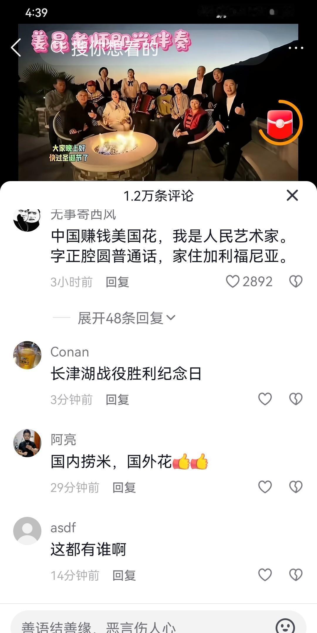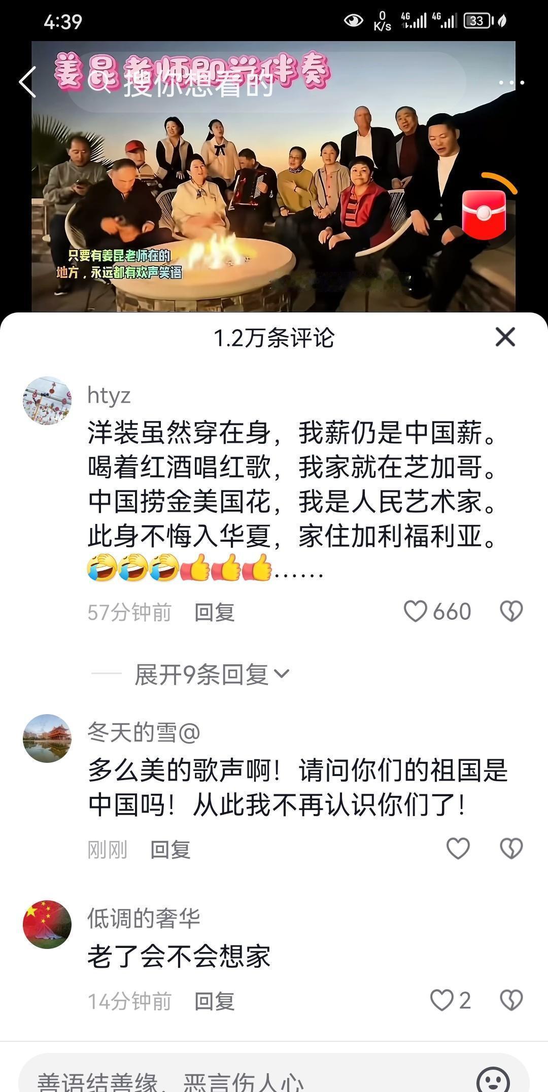 圣诞节来临,我们的许多艺术家在北美的一个大院欢聚一堂,共唱一首《我和我的祖国》。 视频画面里,冬日庭院的灯光映着笑脸,熟悉的旋律穿过时差与屏幕,却在评论区撕开一道争议的口子。 “家住加利福尼亚,此生不悔入华夏”——这条带着捂脸表情的留言,像根刺扎进公众视线。 有人盯着屏幕里晃动的酒杯与合唱的身影,忍不住叩问:当老美在芯片禁令里层层加码时,大洋彼岸的“一刻也不能分割”,该如何落地? 艺术家们或许没想那么多。或许是圣诞氛围里的思乡情切,或许是跨国聚会上的文化展示,又或者,只是朋友圈式的即兴记录。 但现实语境早已变了味。从领事馆关闭到科技封锁,从贸易摩擦到舆论抹黑,中美之间的空气早不似十年前那般轻盈。 这让人想起上月文旅部提醒犹在耳畔,仍有游客执着赴日最终滞留机场的新闻。两起事件相隔不过数周,却共享着同一个舆论痛点:口号与行动的距离。 “艺术无国界”的说法在互联网上飘了太久,久到有人忘了国界真实存在的重量。你可以在画廊里欣赏毕加索,却不能在芯片实验室里谈论“无国界”;你可以在音乐厅演唱民谣,却不能无视签证上的入境章与外交辞令里的锋芒。 有没有另一种可能?比如这只是一场单纯的文化联谊,歌声里本无复杂深意?但公众的愤怒恰恰源于此——当生存空间被挤压时,人们对“爱国”二字的定义会自动收缩,从宏大叙事落到具体行为:是关键时刻的立场坚定,是日常选择里的清醒认知。 那些在海外大院里扬起的歌声,像面镜子照出两种现实:一边是屏幕前为生计奔波的普通人,在油价电价里感受着国际博弈的余震;一边是聚光灯下的艺术家,在异国庭院里唱响“祖国”的旋律。 讽刺感由此而生——不是反对唱歌,是反对将爱国简化成KTV式的抒情;不是否定跨国交流,是质疑为何总在需要清醒时选择“天真”。 就像有人在评论区补的那句:“要是真唱到心坎里,不如回来看看冬天的东北,听听边防战士的巡逻脚步。” 这场争议终会平息,但留下的叩问不会消失:当“地球村”的童话遇上现实的铁丝网,我们该如何定义脚下的土地与肩上的责任? 毕竟,比歌声更响亮的,永远是踏在故土上的脚步声。
