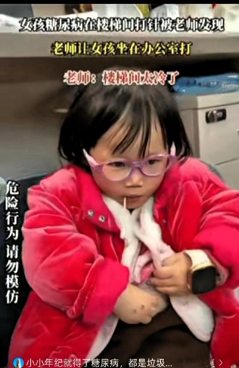 她好可怜!小女孩在课间偷偷的去楼梯间打针,被老师撞到,原来小女孩有糖尿病,她怕在教室里打针吓到同学 课间十分钟,教学楼的楼梯间里,一个10岁的小女孩正缩在角落,安静地给自己打针。 路过的老师撞见这一幕,连忙上前询问。原来女孩患有糖尿病,每天都需要按时注射药物来控制血糖。她没有选择在教室里操作,是担心针头会吓到同学,也怕引来不必要的围观,这才特意躲到这个又安静又少有人来的角落。 老师听后心里一阵发酸,当即领着女孩往办公室走,一边帮她找温水,一边轻声叮嘱:“以后想打针就直接来办公室,这里暖和,也没人会打扰你。” 本该是在操场撒欢、缠着大人要零食的年纪,这个小女孩却早早学着和疾病相处。她要记准每天打针的时间,要克制对甜食的渴望,要默默承受身体的不适,甚至还要顾虑身边人的感受,把自己的难处悄悄藏好。 很多人不清楚,儿童糖尿病主要分1型和2型。1型多与遗传、自身免疫相关,患者通常需要终身依赖胰岛素治疗;2型则可以通过调整饮食结构、坚持规律运动来稳定血糖。不管是哪一种类型,对一个孩子来说,都是需要长期面对的考验。 这个小女孩的懂事,让人忍不住心疼。她没有因为生病就变得娇气,反而处处替他人着想,小小年纪就有了超出年龄的体贴和成熟。 而这位老师的举动,也格外暖心。她没有过度追问孩子的病情,更没有流露出异样的眼光,只是用简单的举动,给了孩子一份实实在在的尊重和关怀。 在校园里,或许还有不少这样默默与疾病抗争的孩子。他们不需要特殊的照顾,只希望能被当成普通同学一样对待,拥有一份不被打扰的自在。 愿每个生病的孩子,都能被温柔以待;愿每一份善意,都能为他们驱散成长路上的阴霾。