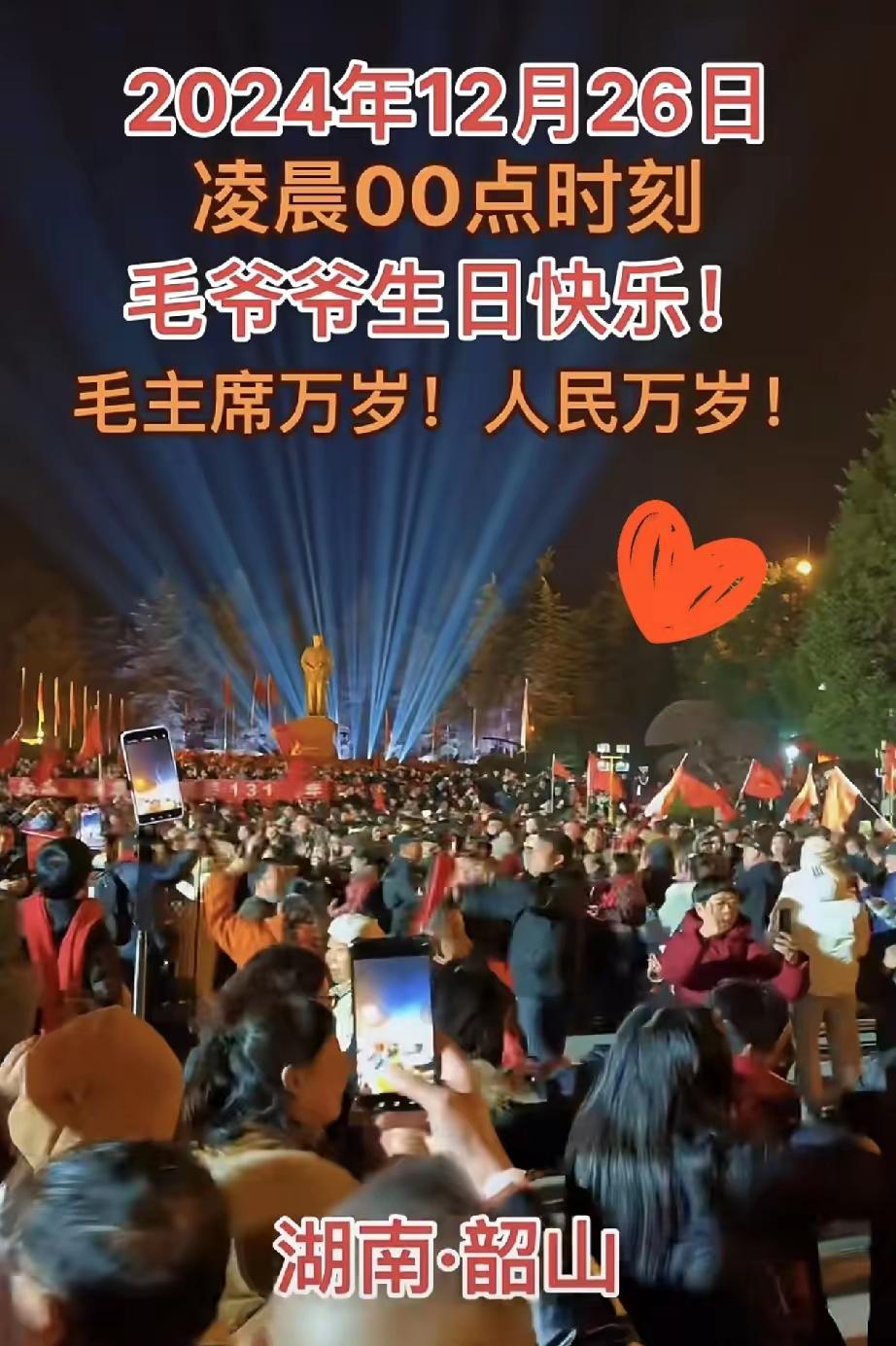 今天刷到了好多这张照片,满屏都是韶山零点的盛况,真的太火了!因为今天是毛爷爷的生日! 屏幕里人山人海,灯火映天,来自五湖四海的人举着红旗,齐声喊“毛爷爷生日快乐”,那个声音隔着屏幕都觉得震撼。 风里有人裹着厚外套,有人捧着菊花,还有老人红着眼眶鞠躬,这个简单的画面越看越暖。 让我想起了课本里的一句话“数风流人物,还看今朝”,如今国泰民安,这就是对他最好的告慰吧!毛主席万岁!人民万岁!🇨🇳