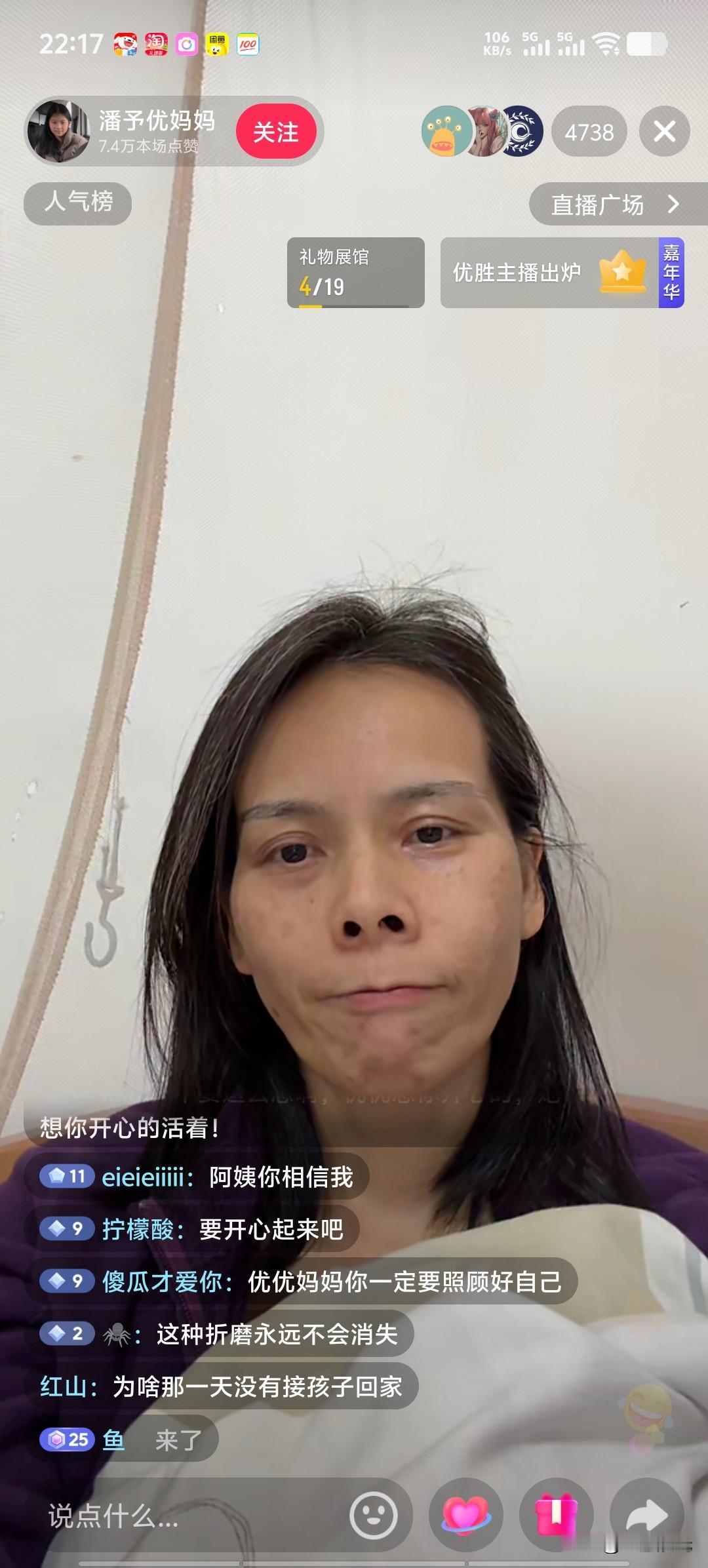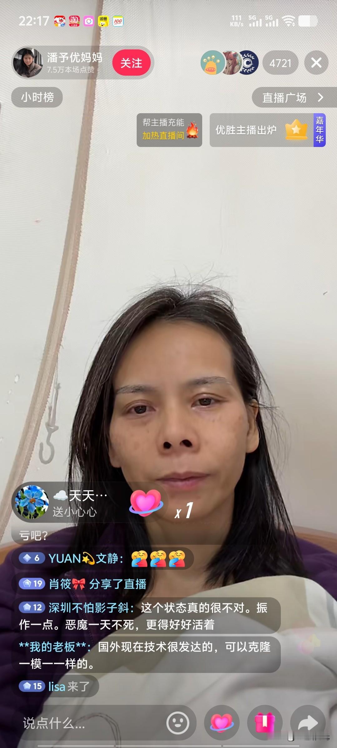 刚刷到优优妈妈的直播间,她说她现在不敢笑,一笑就觉得对不起女儿,也不敢大哭,怕影响别人。网友劝她去山里住一段时间。 这也是一个方法,如果优优妈妈去山里,去大家不认识她的地方好好生活,先忘掉一些不好的情绪,过一段田园生活,养好自己的身体先,照顾好自己的身心健康。这样也挺好。 还有网友说,优优最大的心愿肯定是希望自己的妈妈开心快乐,让她想开点。 但这句话肯定是开导不了优优妈妈的,直播的她状态不好,白头发增多。希望优优妈妈能好好的。