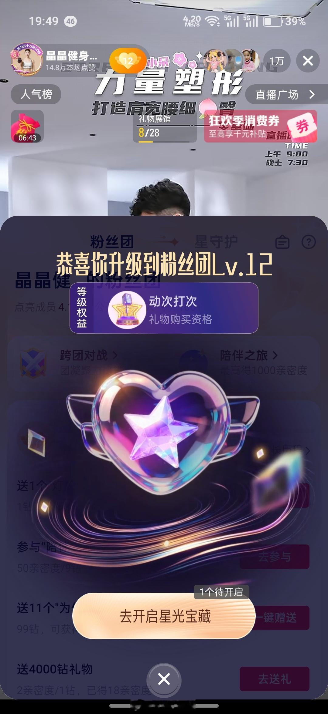 这也太巧了!!原本昨晚晶老师说跨年夜12级以上的同学可以抽奖杠铃,我还在想我才11级,到底什么时候才能升结果今晚居然中了钻石福袋——想着顺便续下灯牌吧,没想到直接给我升到12级了哈哈哈哈🆘有时候缘分就是这么的刚刚好记录下,一年半多的时间☑️(之前老刘那边都只是才10级