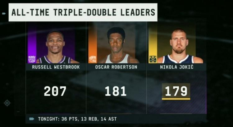 威少的三双纪录快保不住了!约基奇圣诞拿下56分16篮板15助攻,收获本赛季第15次三双,他目前三双次数已经179次,再有2次就追平排第二的大O,距离第一的威少也只差28次,约基奇如果真要刷三双的话,本赛季就能够超越威少,毕竟他有很多时候只差一两个篮板或者助攻,就早早地打卡下班。