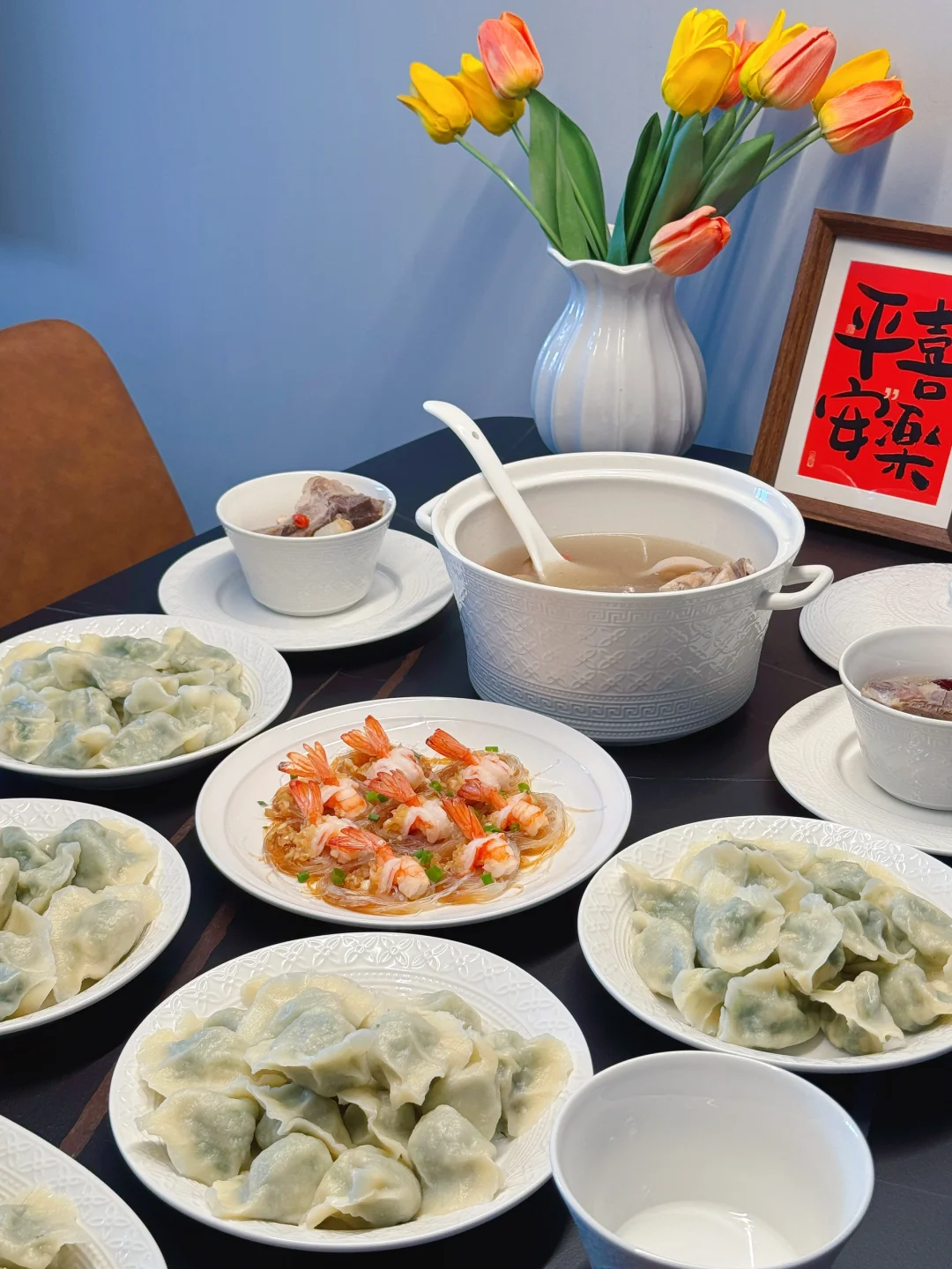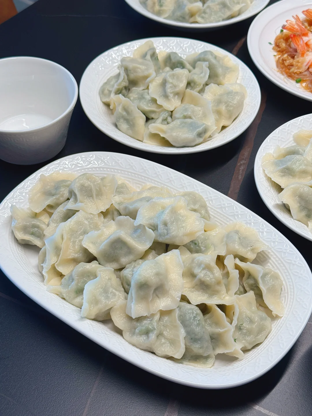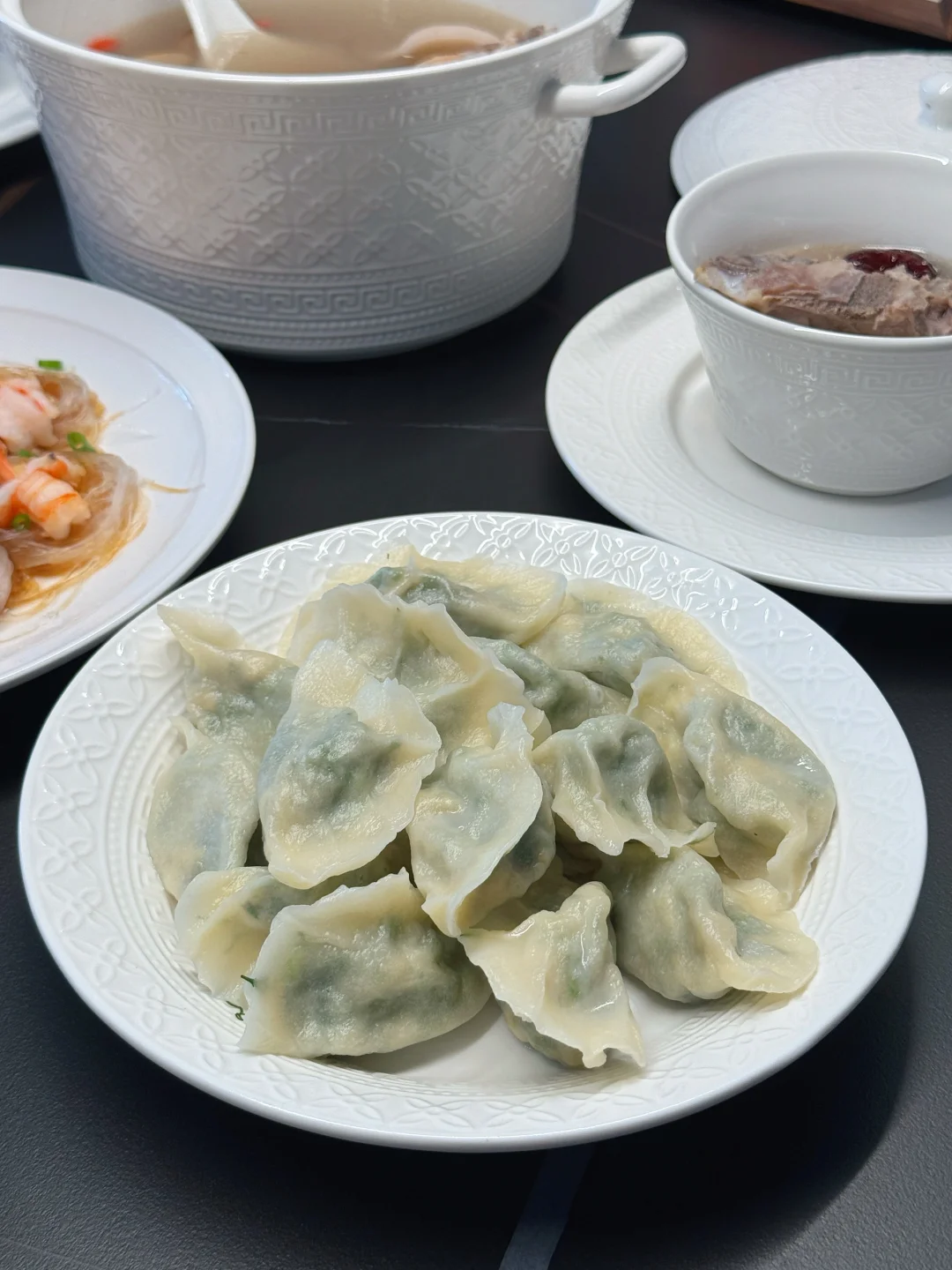 好久没吃茴香馅的饺子了,真馋~ 因为做了美甲💅🏻所以包饺子也不方便了[偷笑R]全程都是老妈包的,我就打打下手~ 今天两种馅:🥟 茴香肉➕茴香鸡蛋 蒜蓉粉丝虾 排骨雪梨莲藕汤 老好吃啦!开饭🥢
