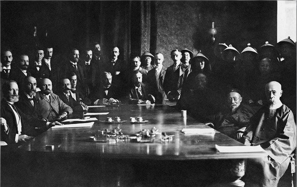 这张照片拍摄于1901年9月7日(光绪二十七年七月二十五日),在北京东交民巷西班牙使馆内,记录了清政府全权大臣庆亲王奕劻和李鸿章(前排坐者右侧第二位)与十一国代表签订《辛丑条约》的现场合影。 照片中左侧为列强代表(多为各国驻华公使、武官),右侧为清政府代表;谈判中列强提出的条款完全是 “城下之盟”,清政府无任何讨价还价的余地,李鸿章签字后两个月(11月7日)病逝北京,临终叹“中国积弱至此”。此案标志清末外交彻底失败,加速王朝崩塌。此照片象征中华民族“百年国耻”之一,常用于警示后人“落后就要挨打”。