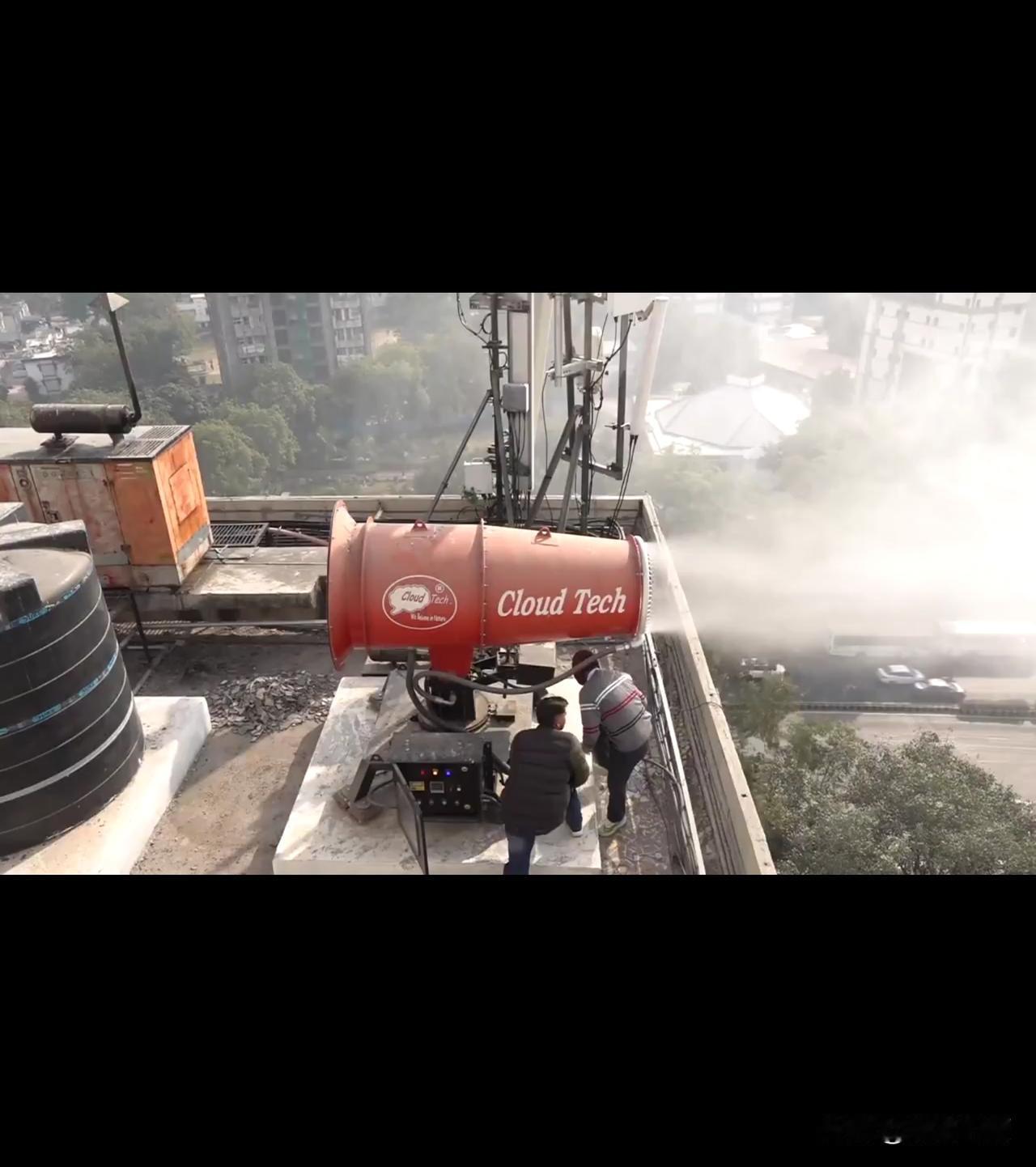 在成为全球污染第一国后,印度终于出手了。 今天在新德里的13座高楼楼顶上,全部安装了这种【防雾霾空气炮】。据说这种喷出水雾的装置,可以大幅降低空气中的各类有害颗粒物。 不过老实说,这玩意儿就相当于把自己家的空气净化器搬到了粉尘车间,就算真能净化空气,也是杯水车薪。