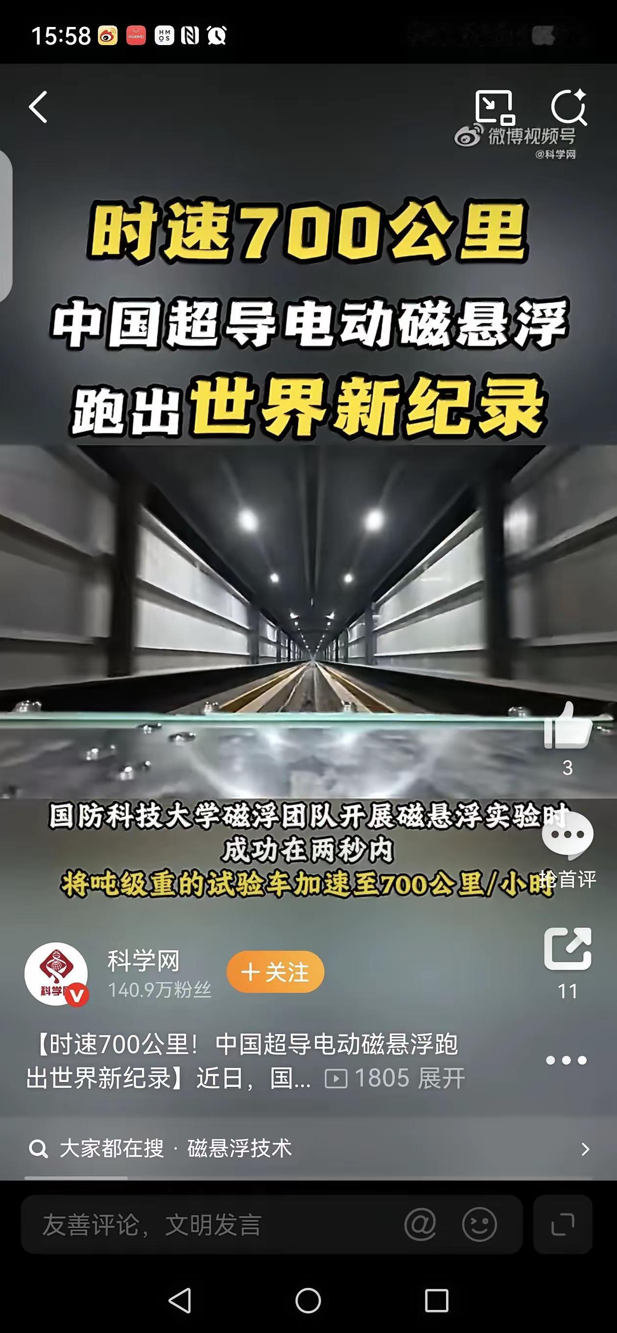 中国的磁悬浮干到时速700公里了,马斯克的胶囊火车还是他的梦想吧? 中国磁悬浮又开挂了!时速飙到700公里,马斯克的胶囊火车还停在图纸上,太爽了! 关键数据太硬核。 400米内,2秒就能加速到700公里每小时。 被加速设备是吨级重量。 具体吨位是机密,暂时不能说。 更让人兴奋的是。 研发单位是国防科技大学。 福建舰航母的电磁弹射器。 也是2秒内加速弹射飞机。 把这些信息放一起看。 中国004核动力航空母舰。 相比003福建舰绝对有质的飞跃。 不只是换成核动力。 新电磁弹射器能支撑更大吨位舰载机起飞。 歼50、歼36,甚至运-15运输机。 都有可能登上004航母! 这些年总有人说科学比技术高级。 可科学原理大家都懂。 能实实在在做出来。 还能低成本运营。 才是真本事,才更有价值。 短短几十年。 新中国在高精尖领域全面超越国外。 又一次站到世界之巅! 有网友说,下一代必将享受盛世中华。 这是对前辈的尊敬。 也是我们这代人的传承。 笔者认为,天佑中华,自立自强才是国人的天佑! 对此,你怎么看呢?
