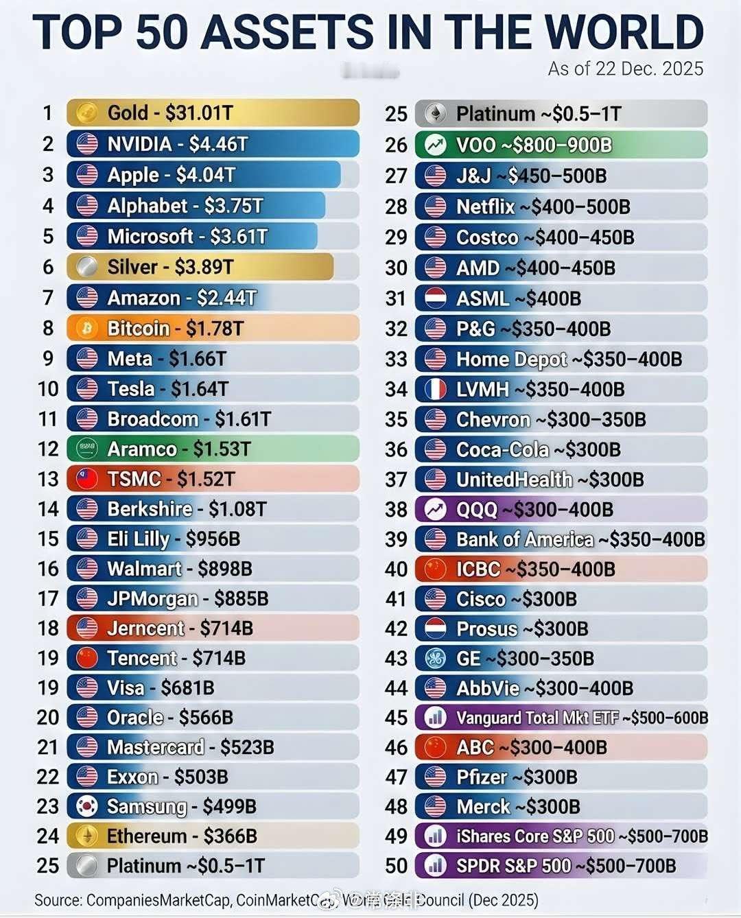 黄金市值已达31万亿美元,白银市值达3.9万亿美元,比特币市值达1.8万亿美元,跻身全球顶级资产之列。然而,它们在投资者投资组合中所占比例仍然很小。如此庞大的市值已使它们成为主要的资产类别,一场范式转变正在发生,并将显著改变资产管理的理念和配置方式。【常涤非观点的动态】2025年12月22日全球前50大资产数据来源:Companies Market Cap、CoinMarketCap、世界黄金协会(2025年12月)常涤非观点 网页链接 来自网易新闻