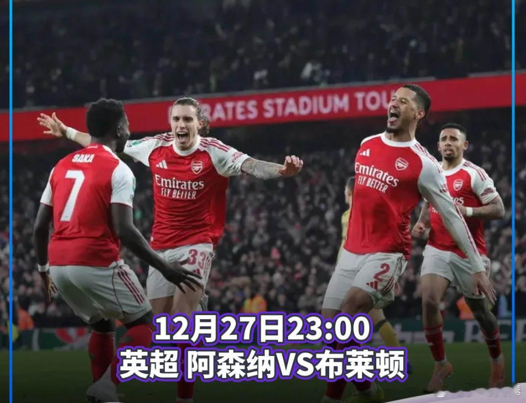 12月27日23:00 英超 阿森纳VS布莱顿足球阿森纳布莱顿 阿森纳历史上33战布莱顿取得18胜7平8负,其中近5次交手取得3胜2平不败成绩。本周中,阿森纳在联赛杯中依靠点球大战主场战胜水晶宫,正赛三连胜被终结,同时无缘主场十连胜,但本赛季13个主场取得11胜2平,目前阿森纳以2分优势领跑英超积分榜。布莱顿最近四轮联赛2平2负,成绩下滑后,落后英超前四5分。本场比赛,阿森纳后防线仍然伤病严重,加布里埃尔、莫斯克拉和怀特均因伤缺阵,在进攻端,哲凯赖什、萨卡以及马丁内利皆是球队重要得分点,但缺乏足够稳定性,赖斯的远射也非常有威胁;布莱顿方面,维尔贝克将反戈一击,他也是该队头号得分手。