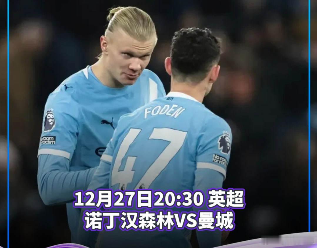 12月27日20:30 英超 诺丁汉森林VS曼城足球 两支球队历史上交锋106次,曼城以45胜28平33负的成绩占据上风,其中近7战诺丁汉森林仅输1场比赛,期间拿下5场比赛,不过蓝月亮唯一一次输球即上赛季做客败北,这也是他们过去6次做客唯一一次失利。在上轮联赛中,诺丁汉森林客场0-1不敌富勒姆,连胜被终结,但该队近6个主场仅1败,期间拿下4胜;曼城主场3-0轻取西汉姆,豪夺七连胜,在英超积分榜上排在第二名,落后榜首2分。本场比赛,诺丁汉森林后卫埃纳、队长叶芝和伍德因伤缺阵,博利、桑加雷和阿沃尼伊因参加非洲杯缺席,这些球员无缘出战,给球队造成很大的影响,不过打进7球的热苏斯,对曼城后防线有一定的威胁。曼城方面,科瓦契奇因伤缺阵,马尔穆什因参加非洲杯缺席,在进攻端,该队严重依赖哈兰德,他过去3场比赛打进5球,本赛季出战23次,打进25球;此外,攻入10球的福登也是球队重要得分点。