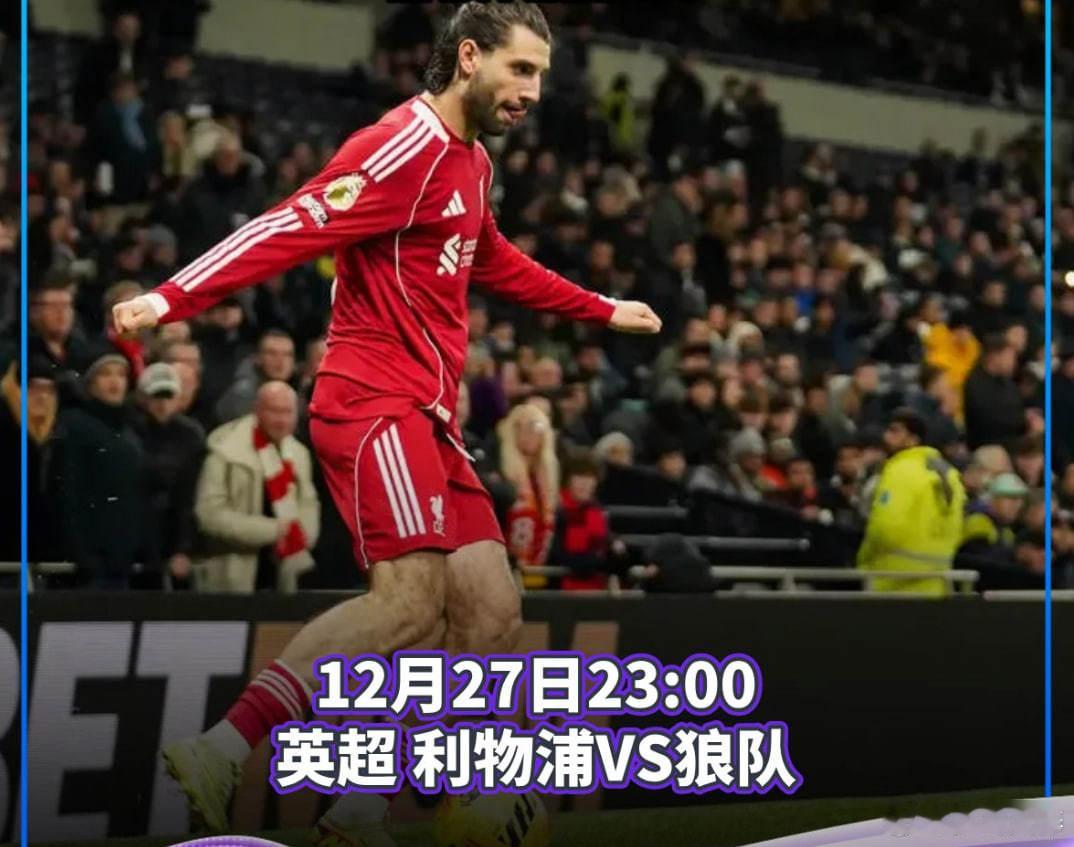 12月27日23:00 英超 利物浦VS狼队足球利物浦狼队 两支球队历史上交锋118次,利物浦以63胜18平37负的成绩占据上风,其中近5战狼队保持全胜,过去15次交手仅1败。在安菲尔德球场,利物浦近8战狼队取得7胜1平。在上轮联赛中,利物浦客场2-1战胜热刺,取得三连胜,近6场正赛不败;狼队在主场0-2负于布伦特福德后,遭遇11连败。目前,在英超积分榜上,利物浦与第四名切尔西平分,狼队仅积2分,排名垫底,落后保级线16分。本场比赛,是利物浦进入英超前四的良机,不过该队两大前锋加克波和伊萨克均因伤缺阵,萨拉赫因参加非洲杯缺席,好在埃基蒂克状态不错,最近三场比赛皆有斩获;此外,索博斯洛伊停赛,这会给球队造成影响。狼队方面,罗德里戈和多赫蒂因伤缺阵,他们是英超进球最少得球队,很难给利物浦后防线造成威胁。