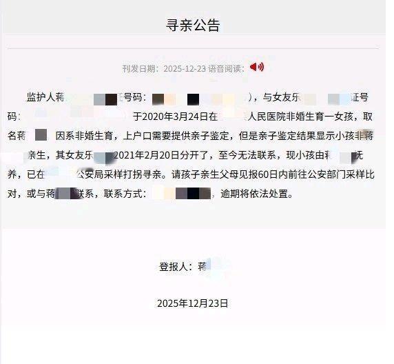 永州这事儿挺让人感慨。38岁的蒋先生,给了女友彩礼,女友同居没多久就生了孩子,他当时就有怀疑。女友2021年离开后,他独自把孩子养到5岁。今年孩子要上小学,亲子鉴定发现非亲生,为了上户口只能发寻亲公告。 蒋先生说养久了有感情,找不到亲生父母就申请领养。可当地民政部门觉得孩子亲生父母可能能找到,蒋先生难领养,派出所则表示孩子先上集体户口。这事儿里,蒋先生重情重义,但后续还得看寻亲结果,希望孩子能有个好未来。